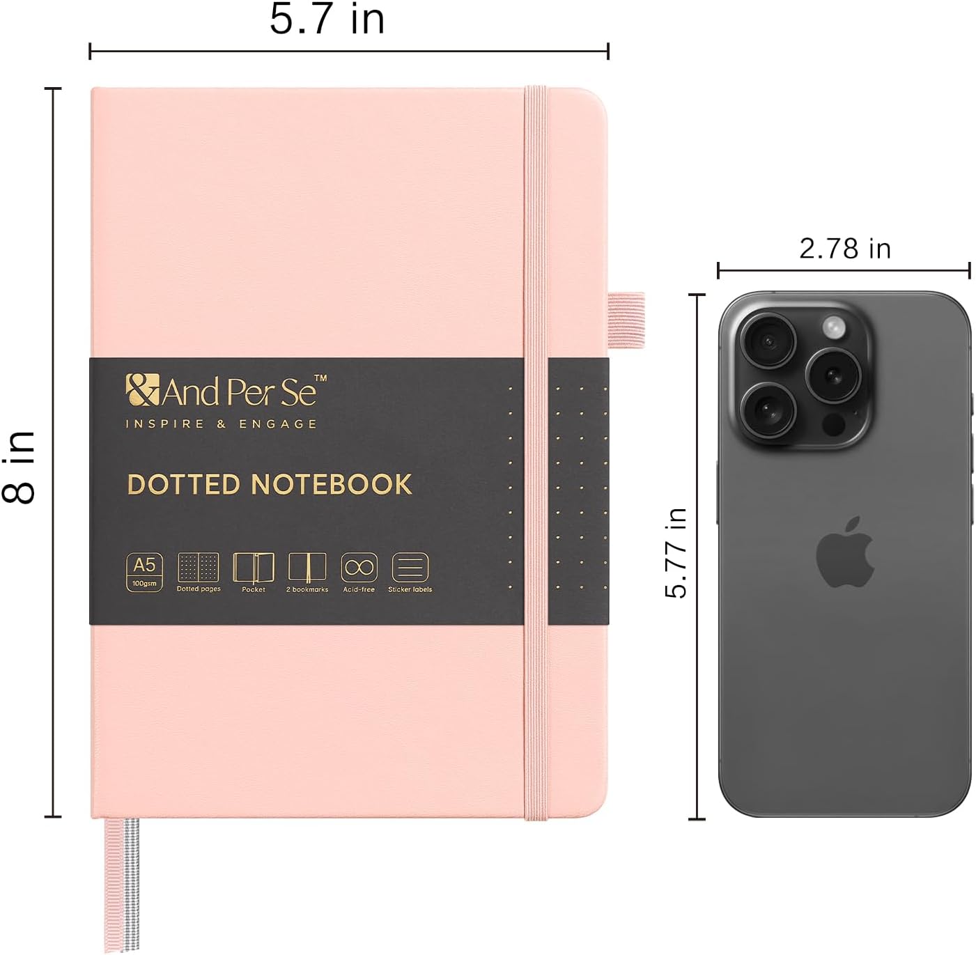 &And Per Se Dotted Journal Notebook, A5 Hardcover Leather Bullet Dotted Journal, 160 Pages 100 gsm Thick Dotted Paper,3 Sheets of Stickers Included - 5.7'' x 8''(Pink)