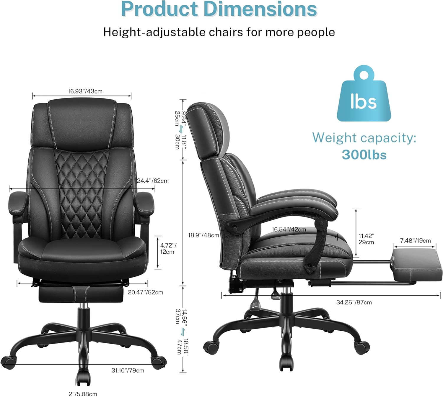 Executive Leather Office Chair, Big and Tall Office Chair with Footrest Home Office Desk Chairs, Ergonomic Computer Desk Chair with Lumbar Support, Reclining Desk Chair with Adjustable Angle