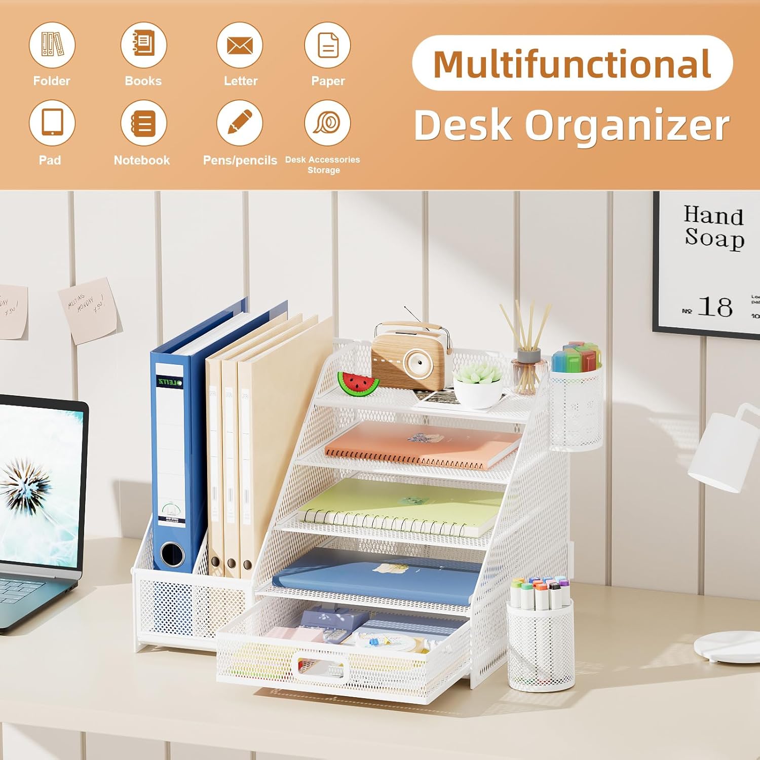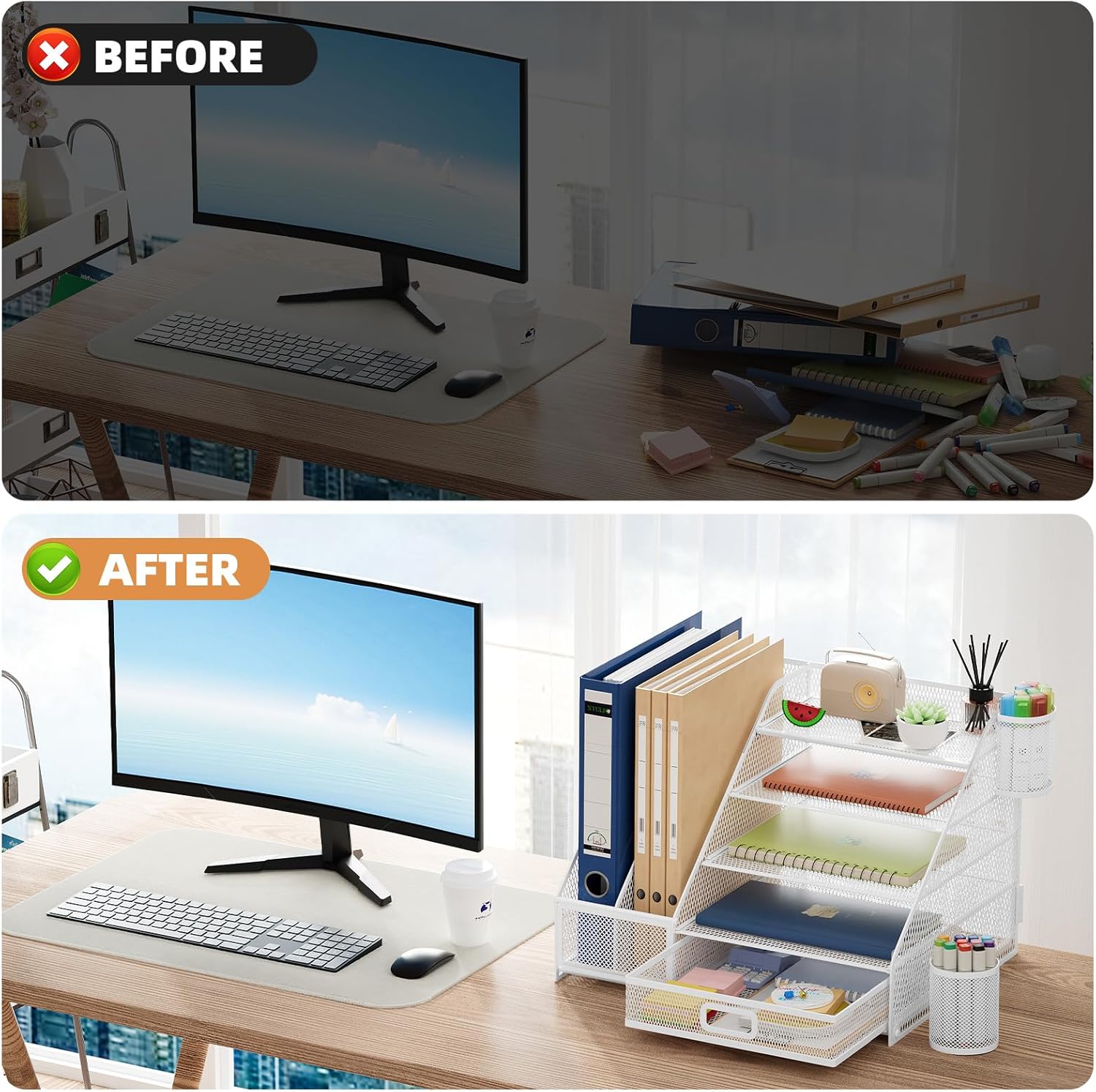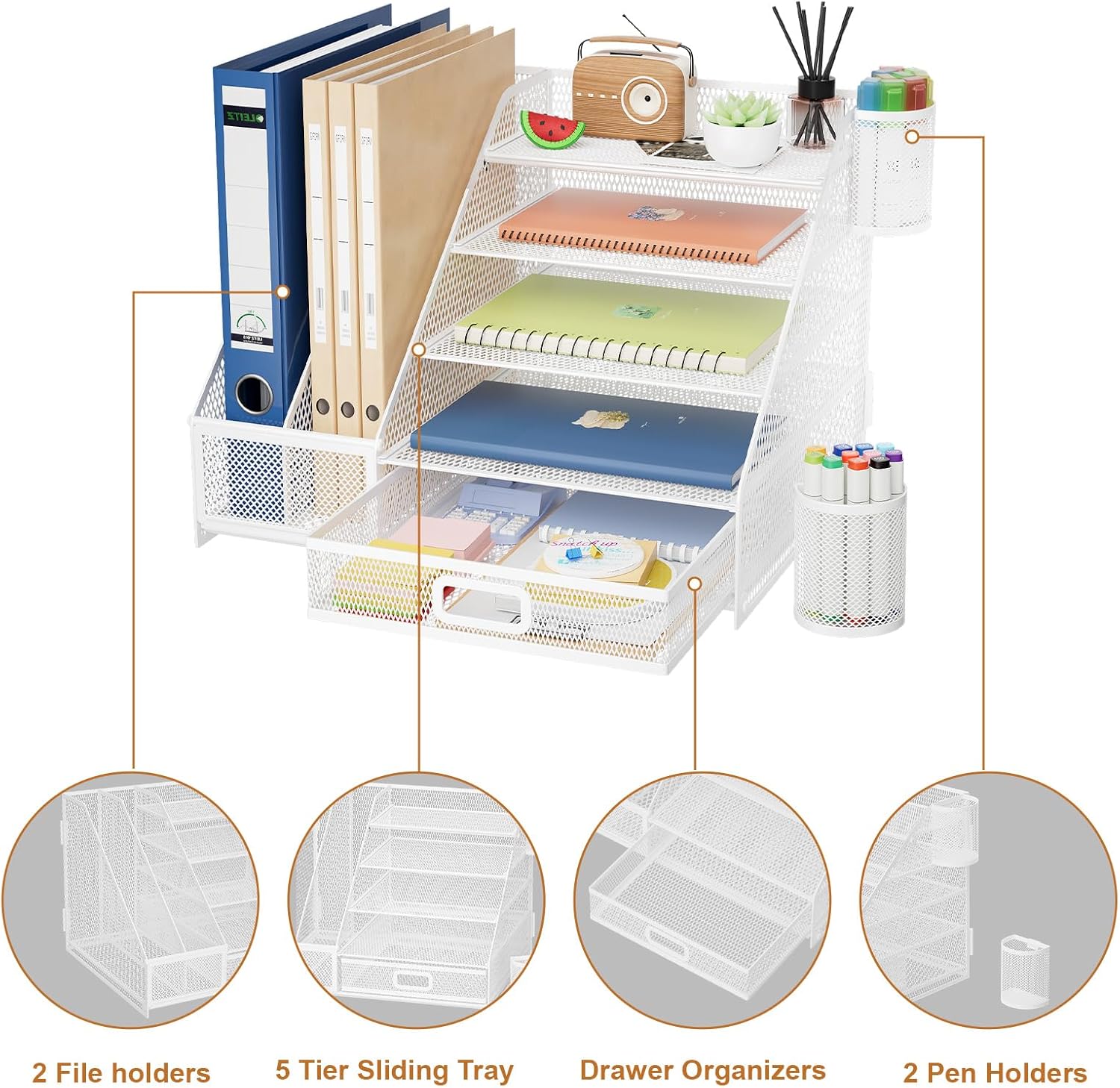 Marbrasse Desk Organizer with File Holder, 5-Tier Paper Letter Tray Organizer with Drawer and 2 Pen Holder,Mesh Desk Organizers and Accessories,Desktop Organizer and Storage for Office Supplies(White)