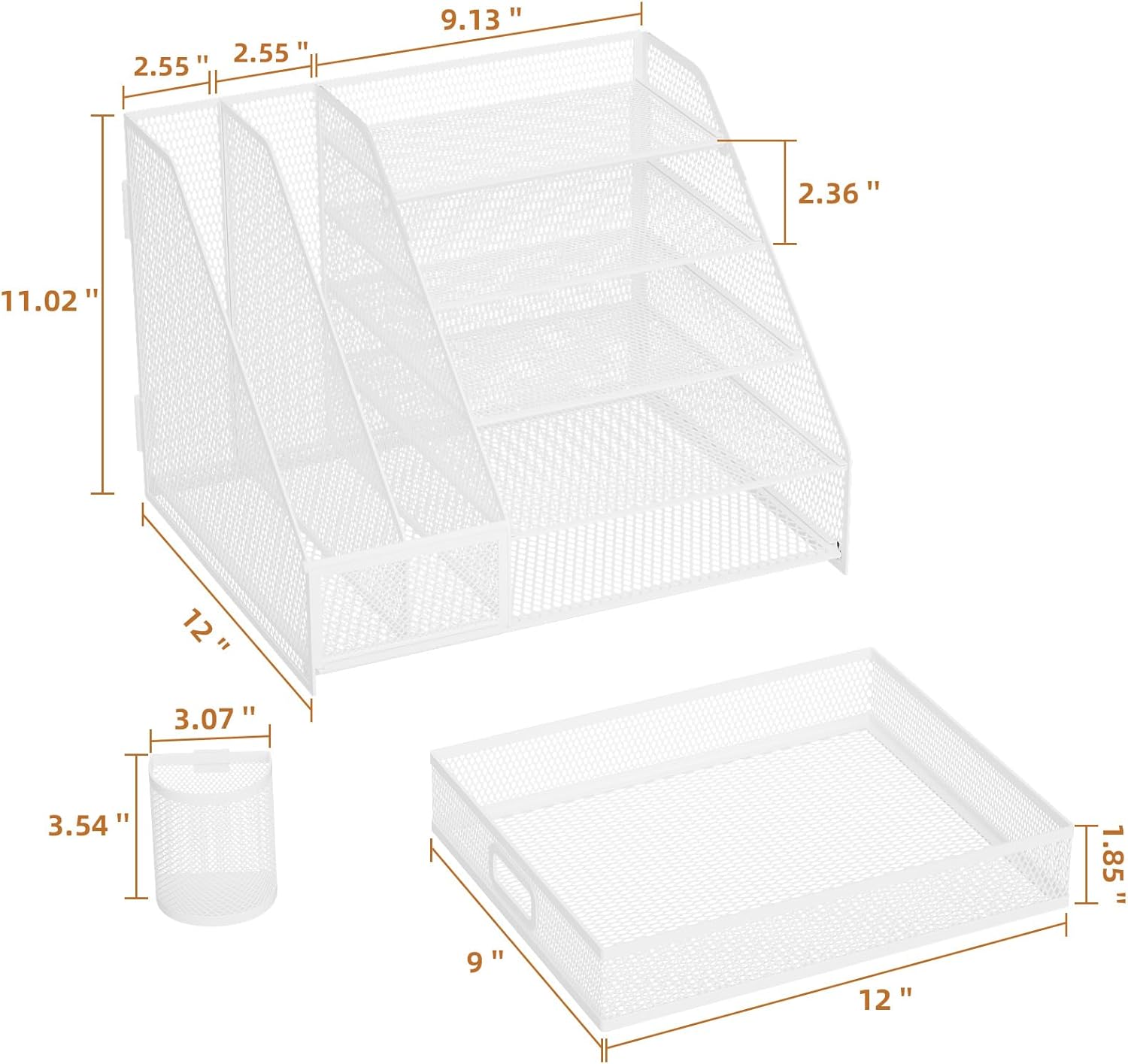 - đăLarge CapacityăThe desk organizer maximizes both the storage area and your desk's available space. For your notebooks, magazines, letters, and A4 paper, the ladder paper tray organizer would provide ample space. If you have documents and folders to store, consider using the vertical file holder to keep your office documents in order. The drawer organizer and hanging pen holder are enough to accommodate all office supply accessories and so on. Perfect Size:14.4*11*12inch.