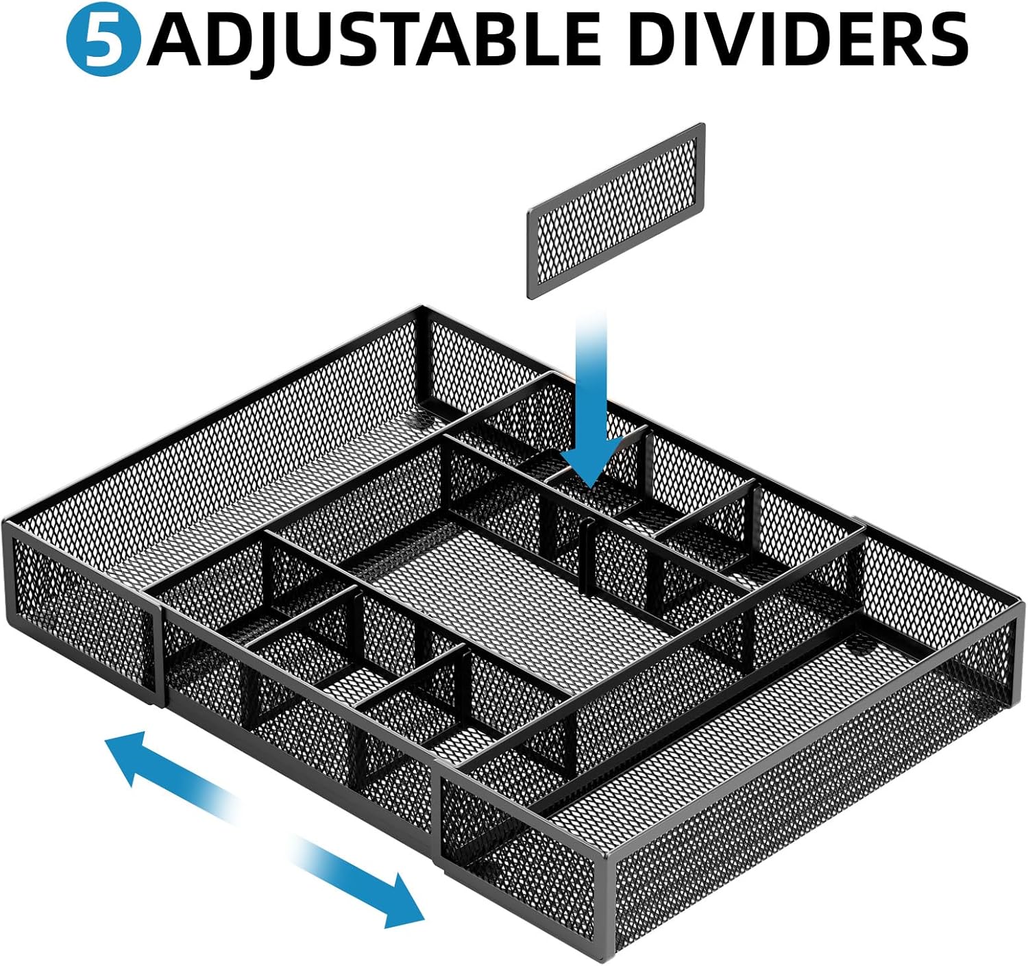 Marbrasse Expandable Desk Drawer Organizer, Mesh Drawer Organizer Tray with 10 Adjustable Compartments, Desk Organizers and Accessories for Office Supplies, Makeup & Vanity (Expandable Black-2 pack)