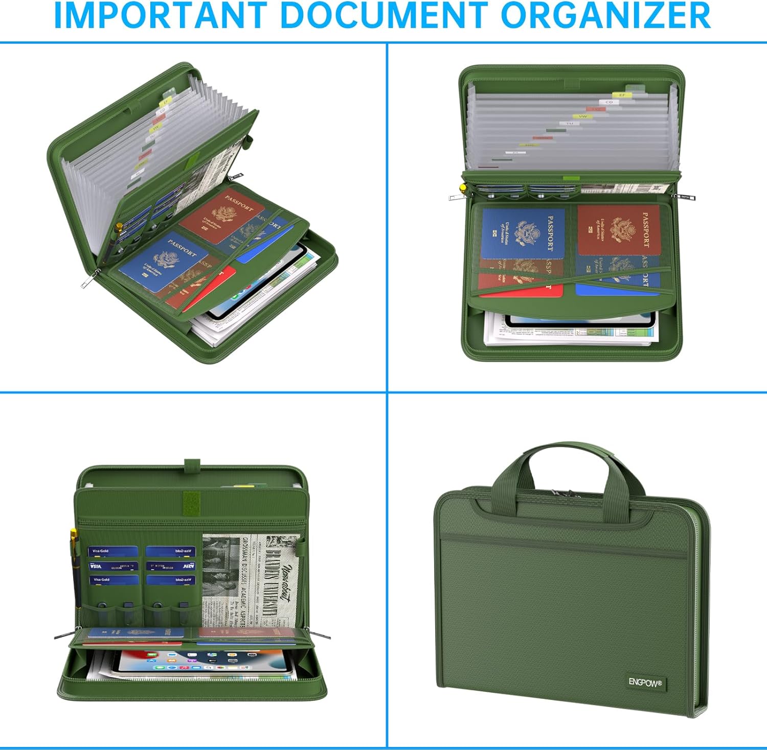 ENGPOW Accordion File Organizer,Fireproof Expanding File Folder with Multi Pockets,13 Pockets Document Organizer with Handle & Labels,Portable Home Travel Safe Storage for Letter A4 Files,Green