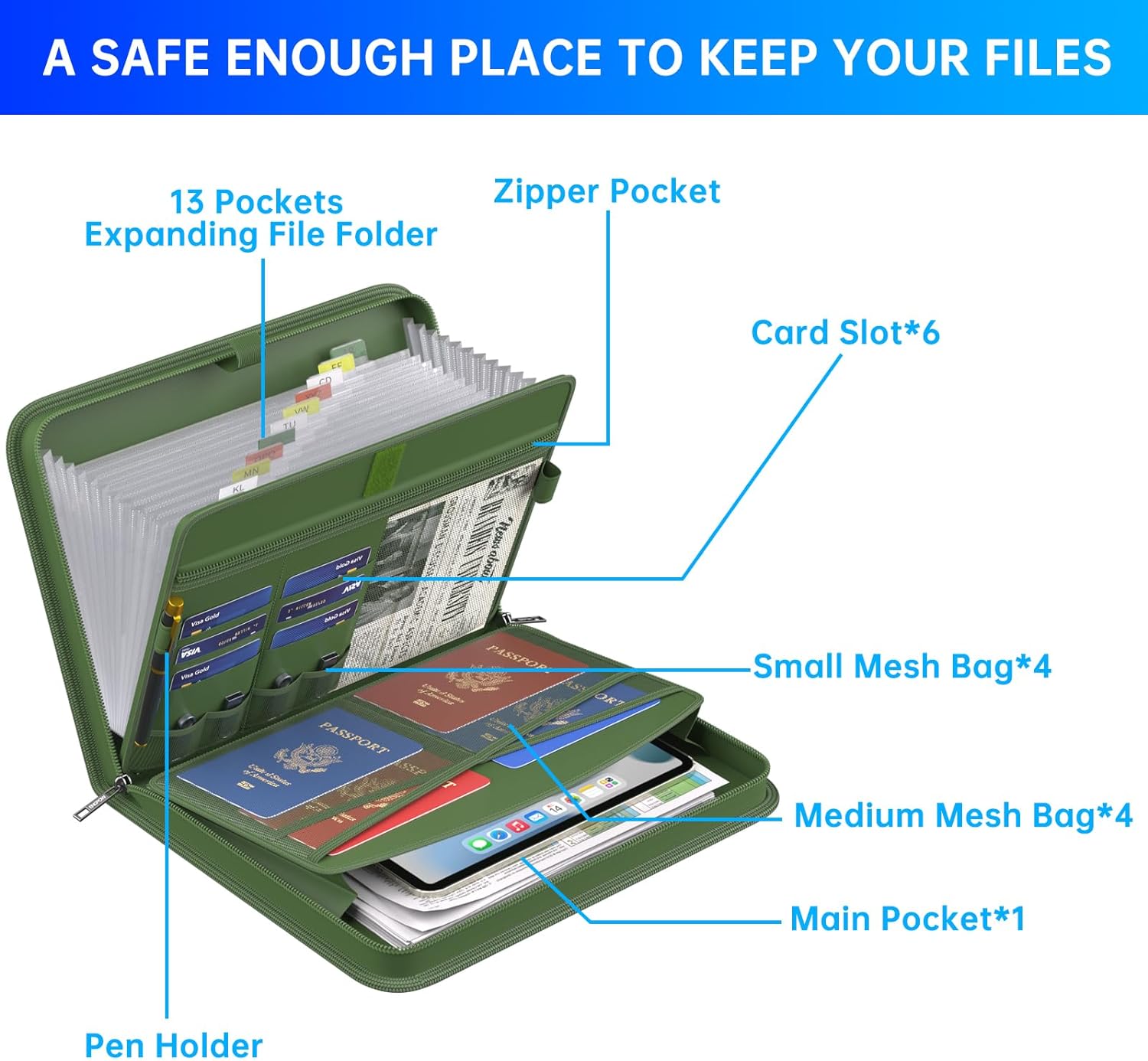 - Large Capacity: 14.2" x 10.4" x 2", Compared with other folders, our Accordian File Organizer adopts a multi-layer design that can meet all your storage needs.These include 13 accordion Pockets with labels(each expanding to 1.2 inches),1 zipper pocket,2 pen slot,6 card slots,4 small mesh bags,4 medium mesh bags,and 1 main pocket. You can securely store all your important documents and other items in this fireproof expanding file folder while effectively classifying and finding your files.