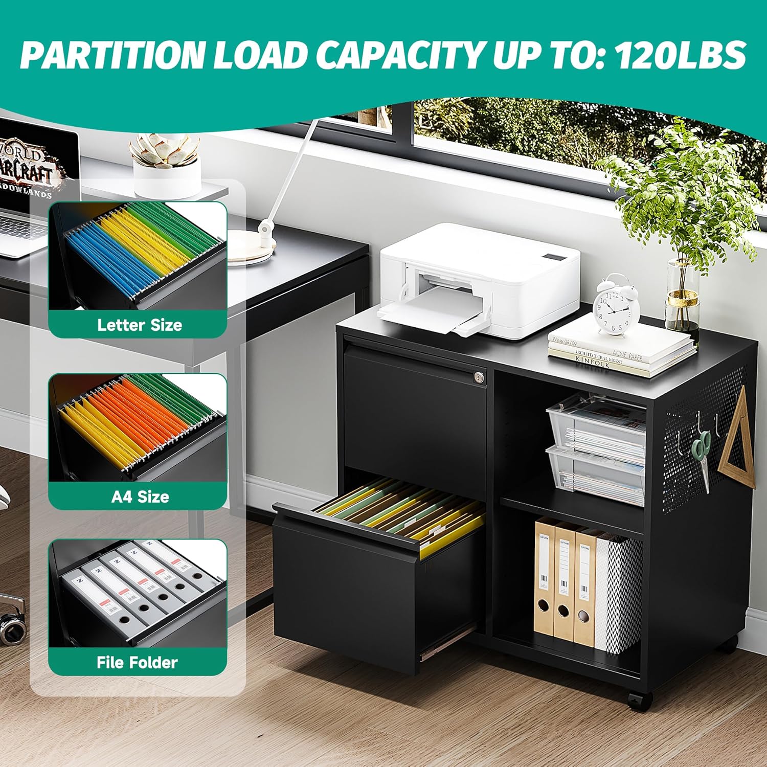 SISESOL 2 Drawer File Cabinet with Lock and Shelf,Mobile Lateral Filing Cabinet,Metal Filing Cabinets with Open Storage Shelves Organizer for Home Office Fit Legal/Letter A4 Size (Black)