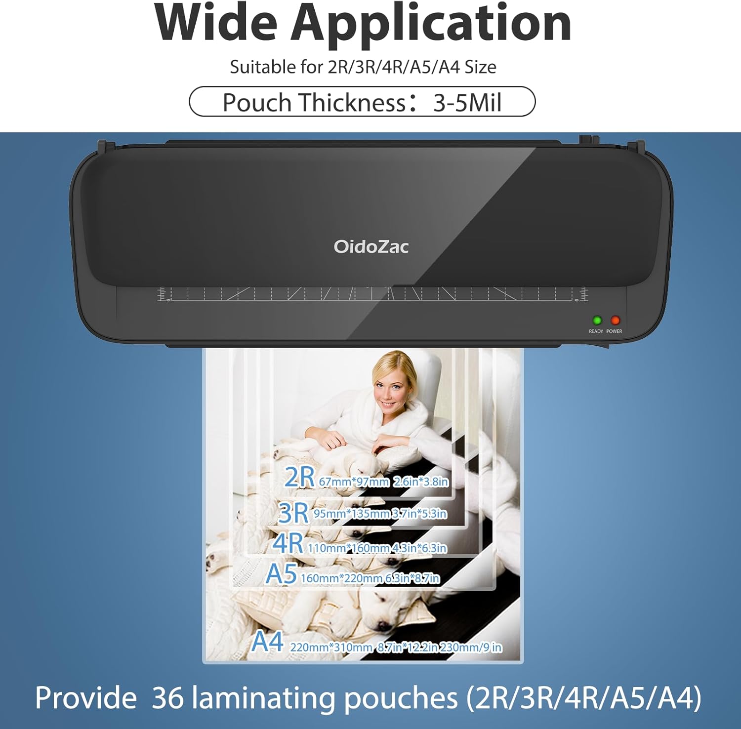 - One-piece Design & Single-Button Control: Our laminator boasts an integrated paper cutter with precise grid lines for easy trimming. A convenient accessory storage slot on the bottom prevents misplacing items, ensuring a seamless start to your laminating tasks. With a single switch slide to HOT or COLD for automatic work, the OidoZac laminator ensures flawless, bubble-free, and wrinkle-free results every time (cold film not included)