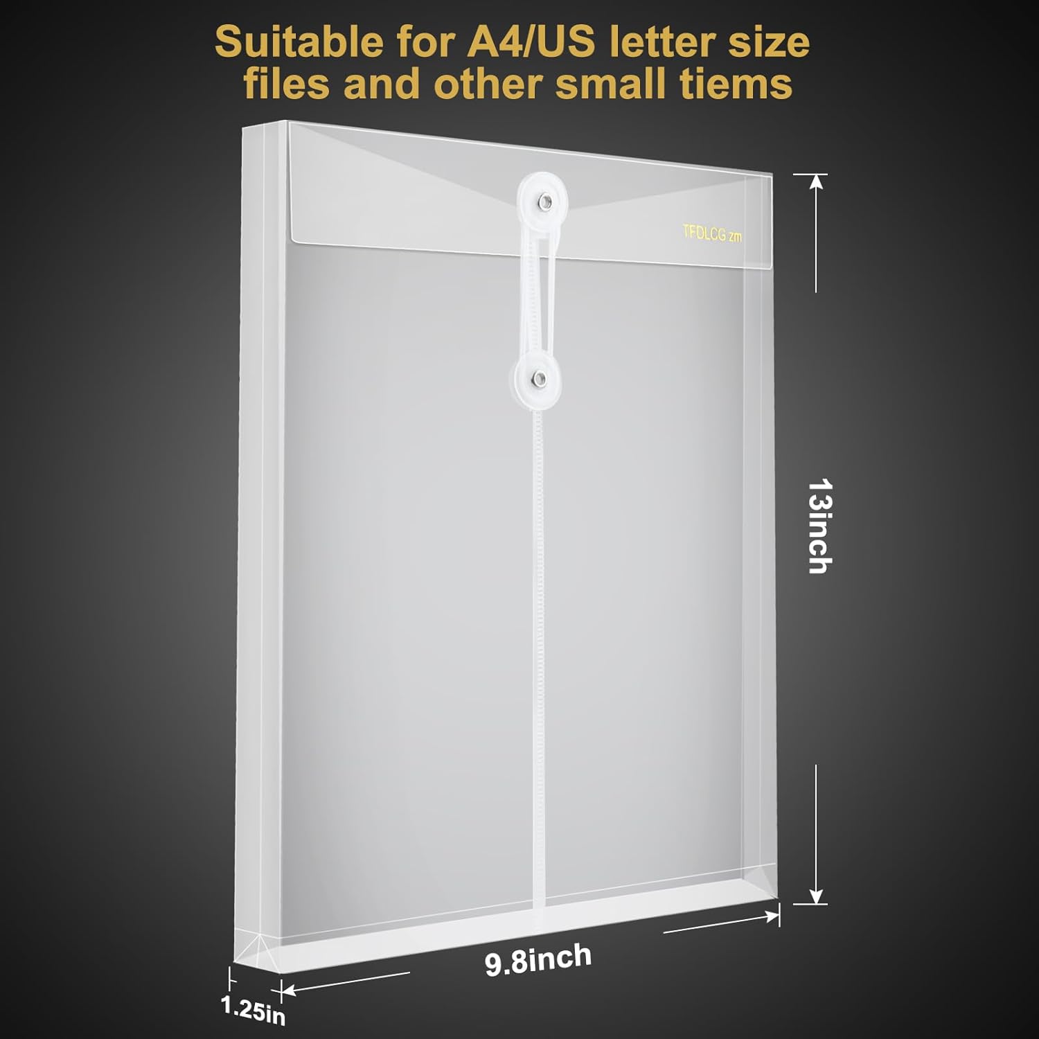 - WITH PROTECTIVE FLAP AND STRING TIE CLOSURE:Transparent file folders are expandable and keep everything intact with the button and string enclosure. The top opening string-tie closure is safe to custody and organize important documents