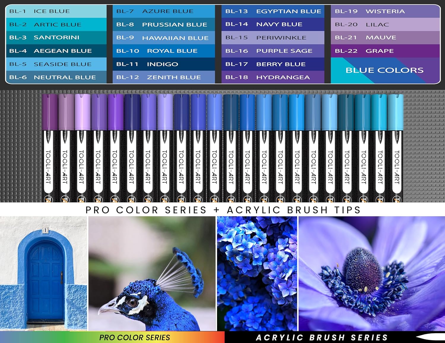 22 Flexible Brush Tip Acrylic Paint Pens Markers Set 1-7mm Line for Rock Painting, Brush Lettering, Glass, Mugs, Wood, Metal, Canvas, Fabric, Plastic. Non Toxic Waterbased Quick Drying Assorted Blue