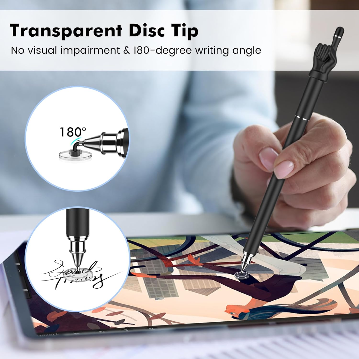 - ăHighly Sensitive and Accurateă The disc tip is transparent which allows visibility of the contact point, making it highly accurate and responsive. 180° flexible writing angle for comfortable using. You can get more smooth writing or painting experience, no lag, no interruption, no screen scratching.