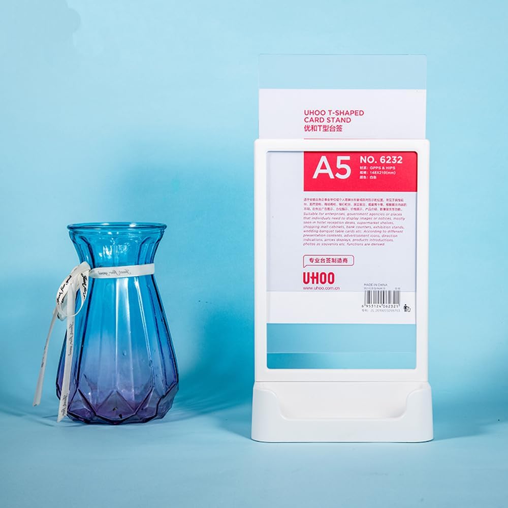 ABS Plastic Sign Holder, Menu Displays T Shape Sign Stand with Business Card Holder, Plastic Display Stand for Ads, Menu, Photos, Business Card (White A4 210×297mm/8.27×11.69 inches)