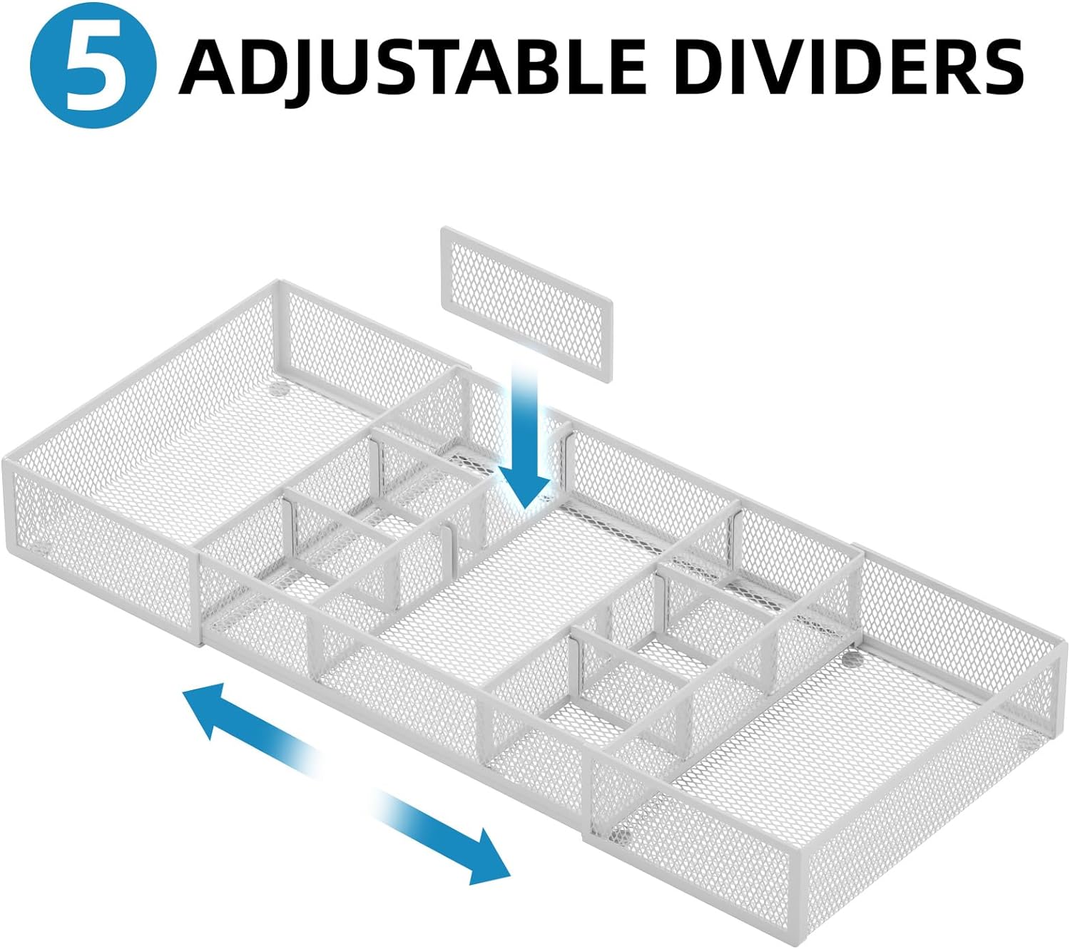 Marbrasse Expandable Desk Drawer Organizer, Mesh Drawer Organizer Tray with 10 Adjustable Compartments, Desk Organizers and Accessories for Office Supplies (Longer Expandable Drawer Organizer-W)
