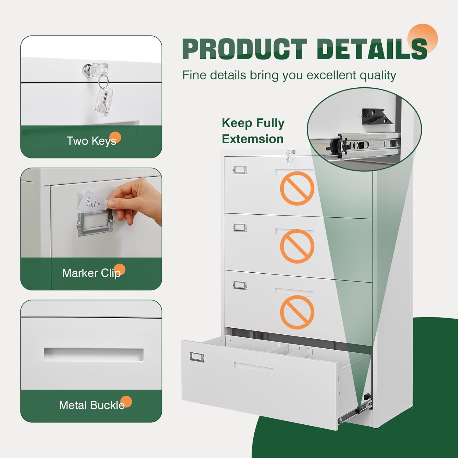 - ăDetail DesignăAll drawers interlocking mechanism design,only one drawer can be opened at a time, it will prevent tipping;High-quality ball slides make it easier and quieter to use.