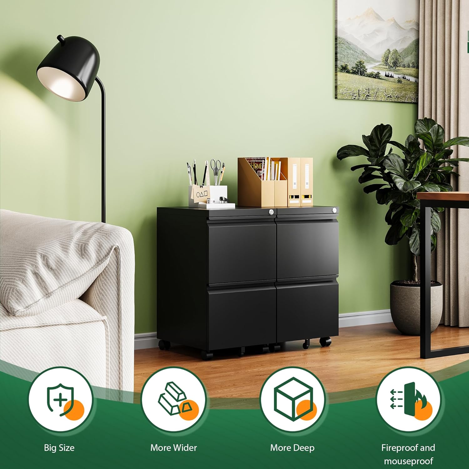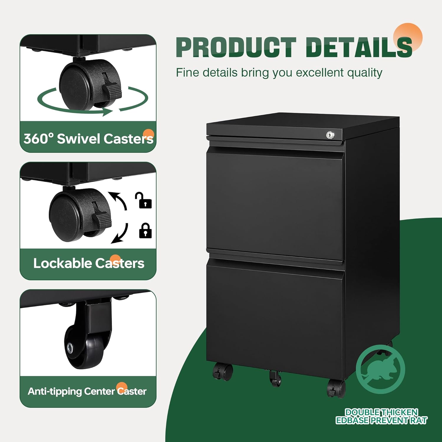 Letaya Mobile File Cabinet with Lock,2 Drawer Under Desk Metal Rolling Filing Cabinets for Home Office Organizer Letters/Legal/A4(Fully Assembled-Black)