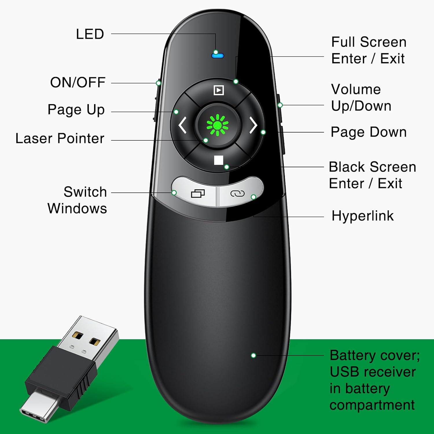- 【More Details】, ①PPT Clicker One-piece back slot usb storage, not easy to lose usb ②Soft and large rubber buttons, no noisy button pressing ③ 2 in 1 usb and type c design, meet all your need! ④ Bumped-buttons design for operating without looking down at it. ⑤ Blue LED keep flashing to indicate Low power need to replace batteries(2 pcs of AAA batteries are not included).⑥What you get: 1 x presentation remote with receiver, 1x user manual