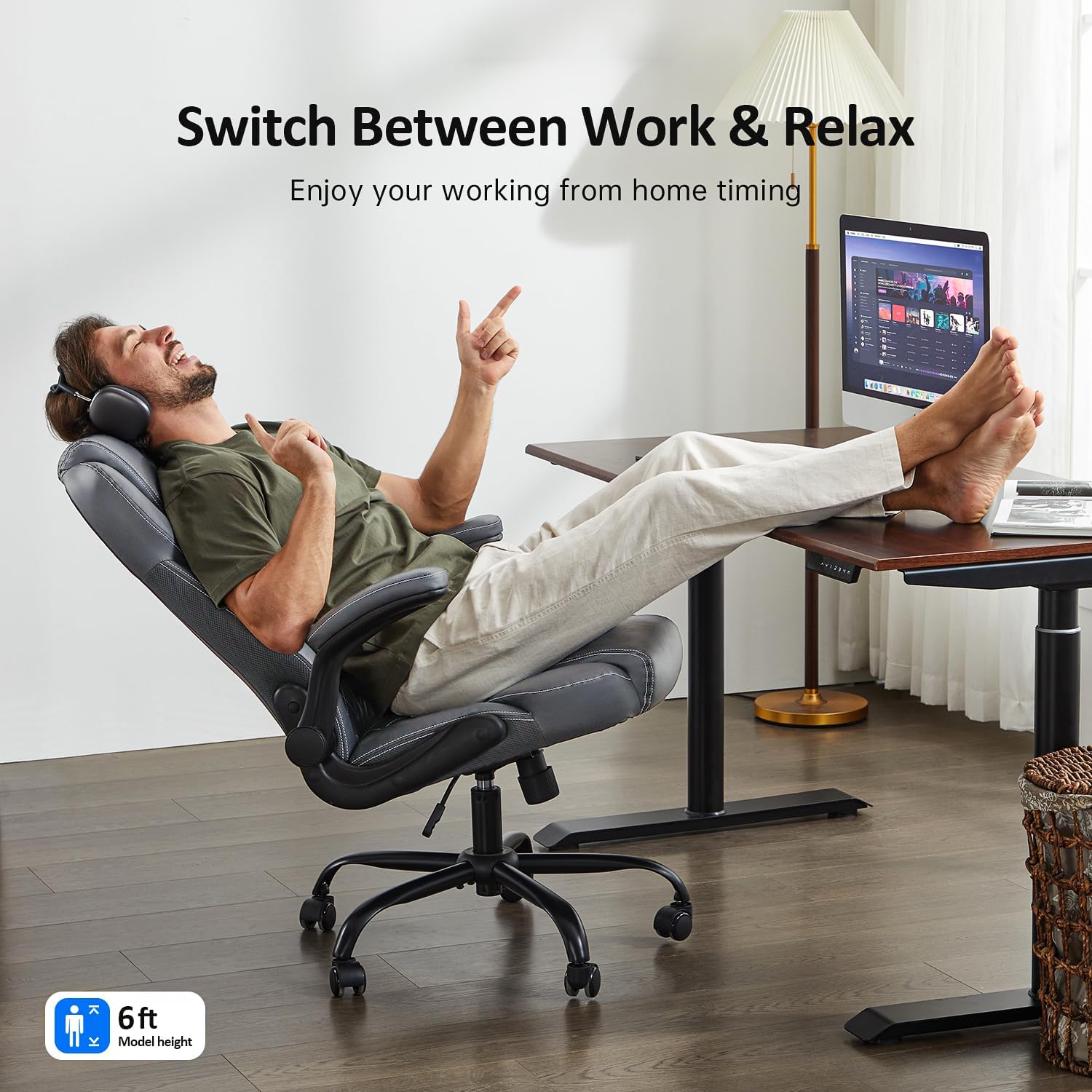 Office Chair, Executive Leather Chair Home Office Desk Chairs, Ergonomic Computer Desk Chair with Adjustable Flip-Up Arms, Lumbar Support Swivel Task Chair with Rocking Function (Gray)