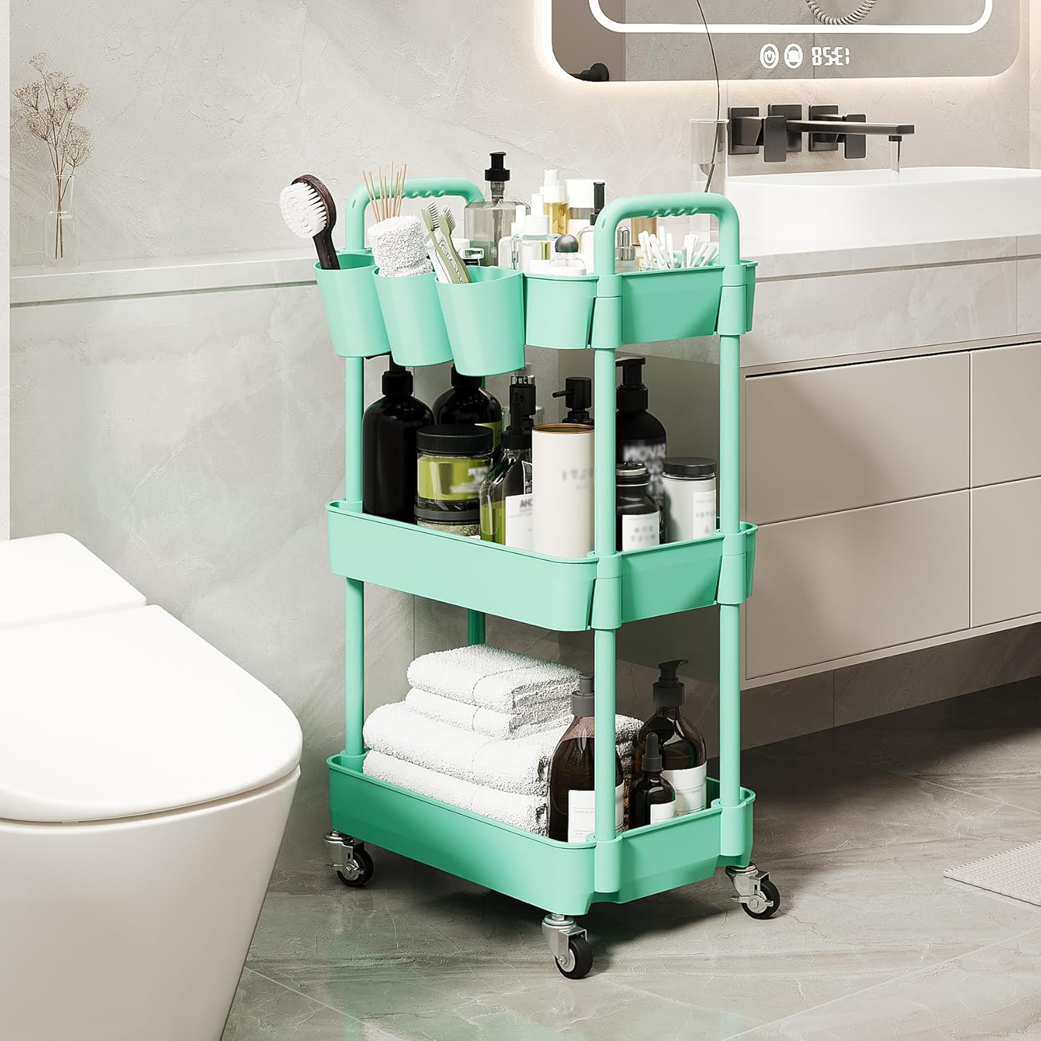 - 【Multifunctional Storage】Rolling utility carts can add extra storage space, 3-tier, classifies it carefully, and are widely used in multiple locations.In the kitchen, store food, seasonings, spice bottles, crisper boxes, paper bags, gadgets.In the living room, store snacks, teacups, books, ornaments.In the bathroom, store toiletries, paper towels, aromatherapy.Besides, it can also be placed in bedrooms, laundry rooms, baby rooms, offices, classrooms and balconies.