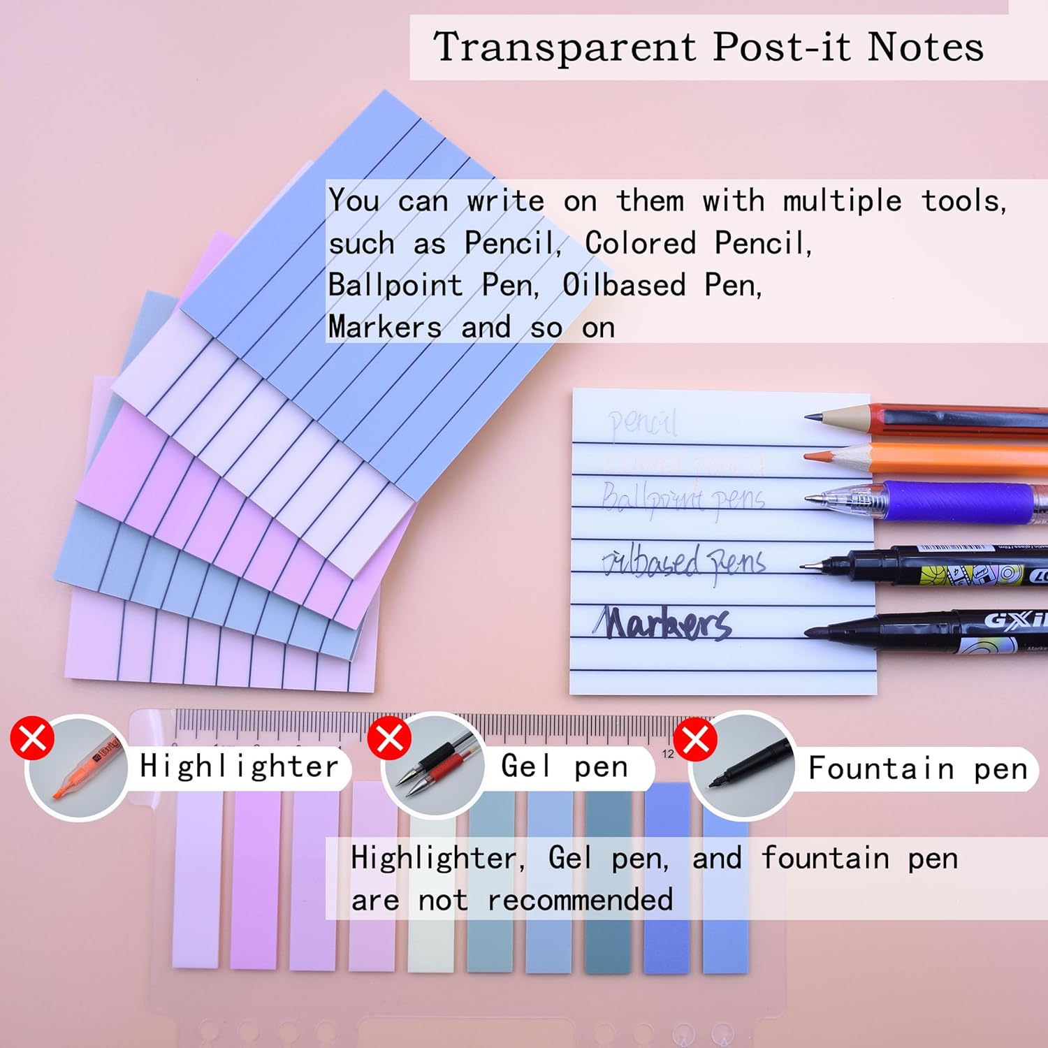 - 【Tips】The transparent sticky notes are made of waterproof PET, and for a better user's experience, please use markers, ballpoint pens, pencils, oil-based markers to write on translucent sticky notes. Gel and water-based pens are not recommended. And our marker pen has thick and thin ends, writes smoothly, is very easy to write anything and dries in seconds.