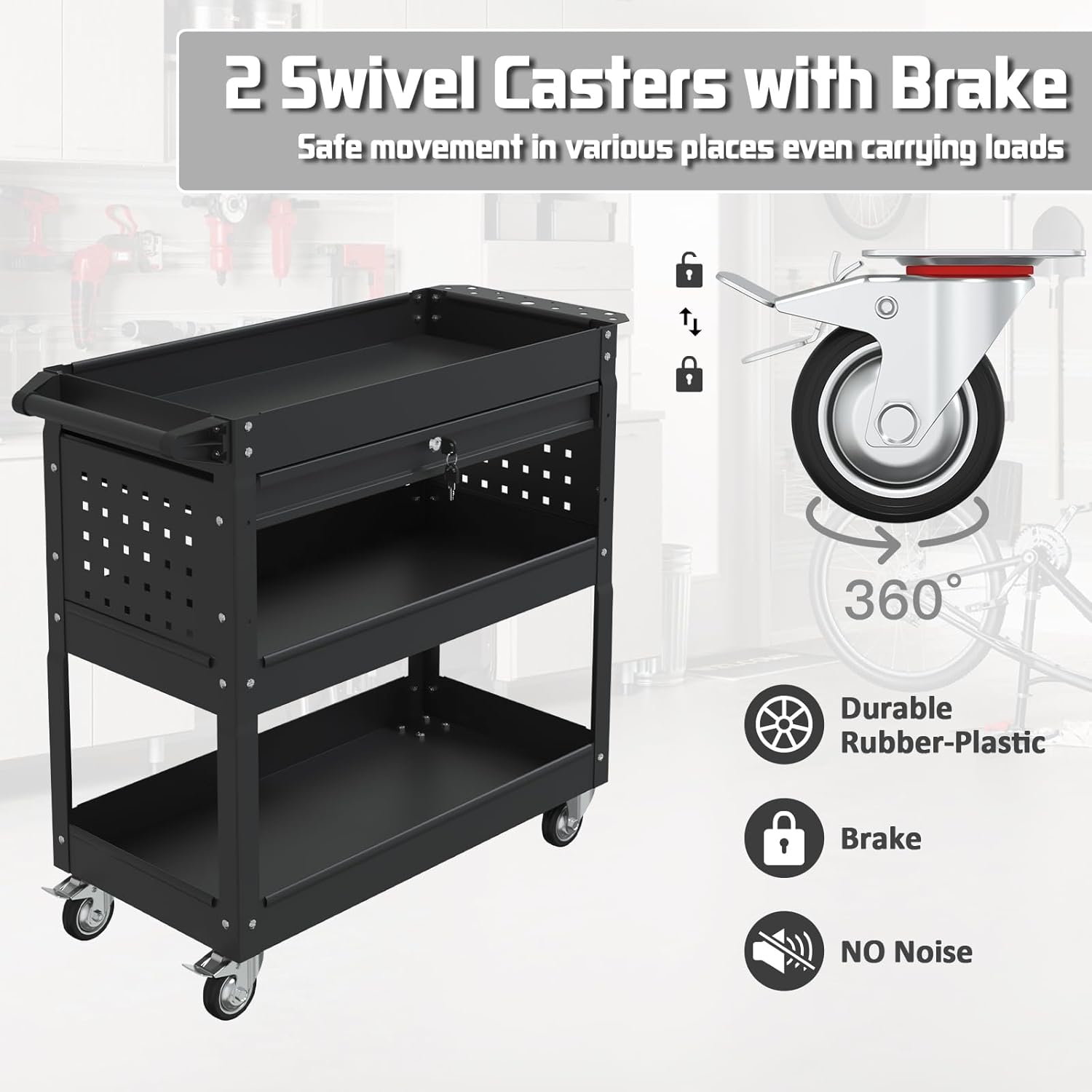 - 【Easy to Move】Pelnuies shop cart with wheels is equipped with 2 universal brake wheels, you can transport heavy objects without extra help, safe and flexible; you can adjust the forward direction of tool cart by rotating 360°, easy to cope with different use scenarios; rubber wrapped brake wheels allow you to operate utility cart without damaging the floor,adapt to various environments of the road.