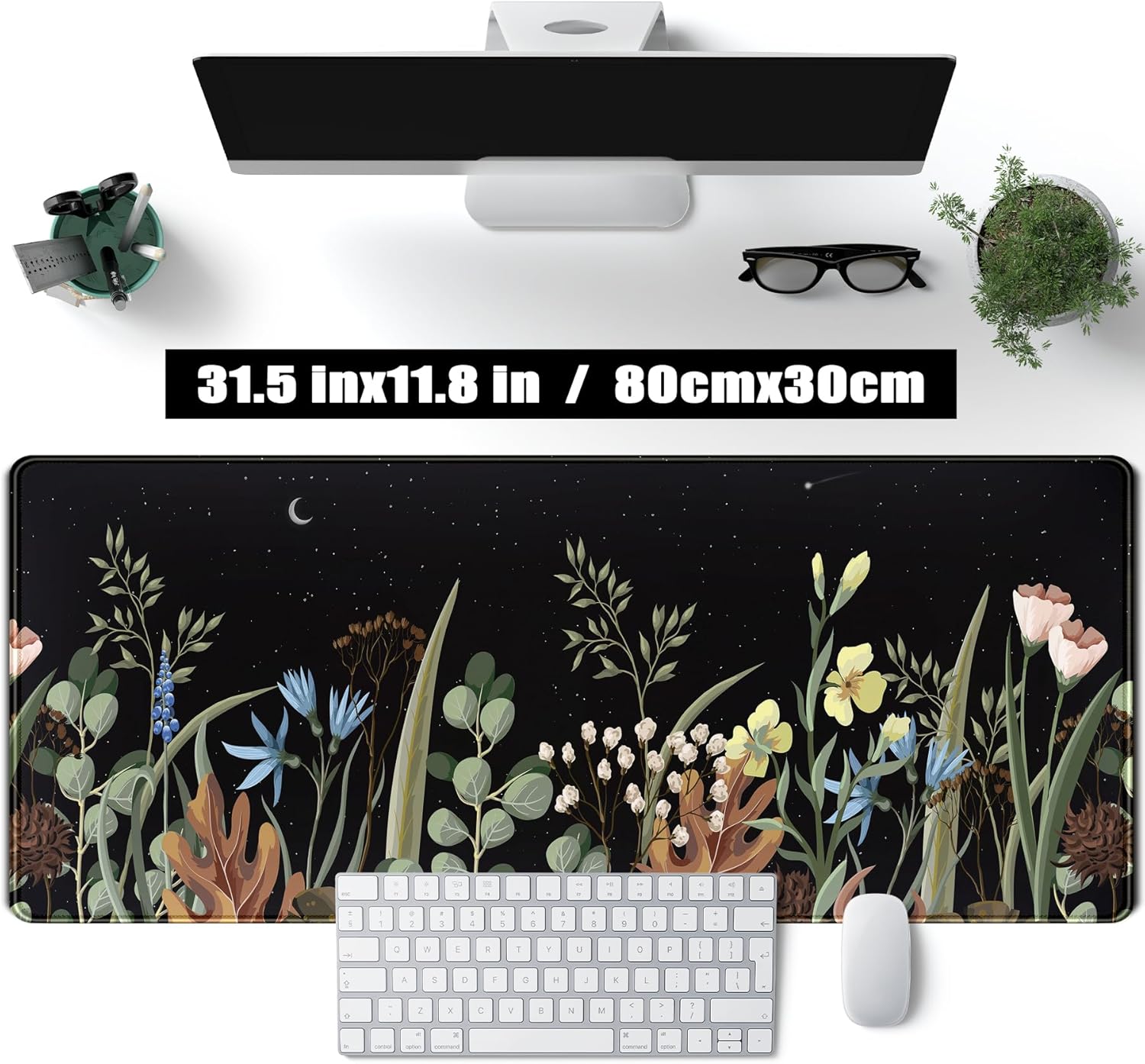 Cute Gaming Black Wild Flowers Desk Mat Mouse Pad Star Moon Floral Mousepad Large, XL Big Computer Keyboard and Mouse Mat Desk Pad Mat with Stitched Edge for Women Office Decor Deskmat 31.5x11.8 in