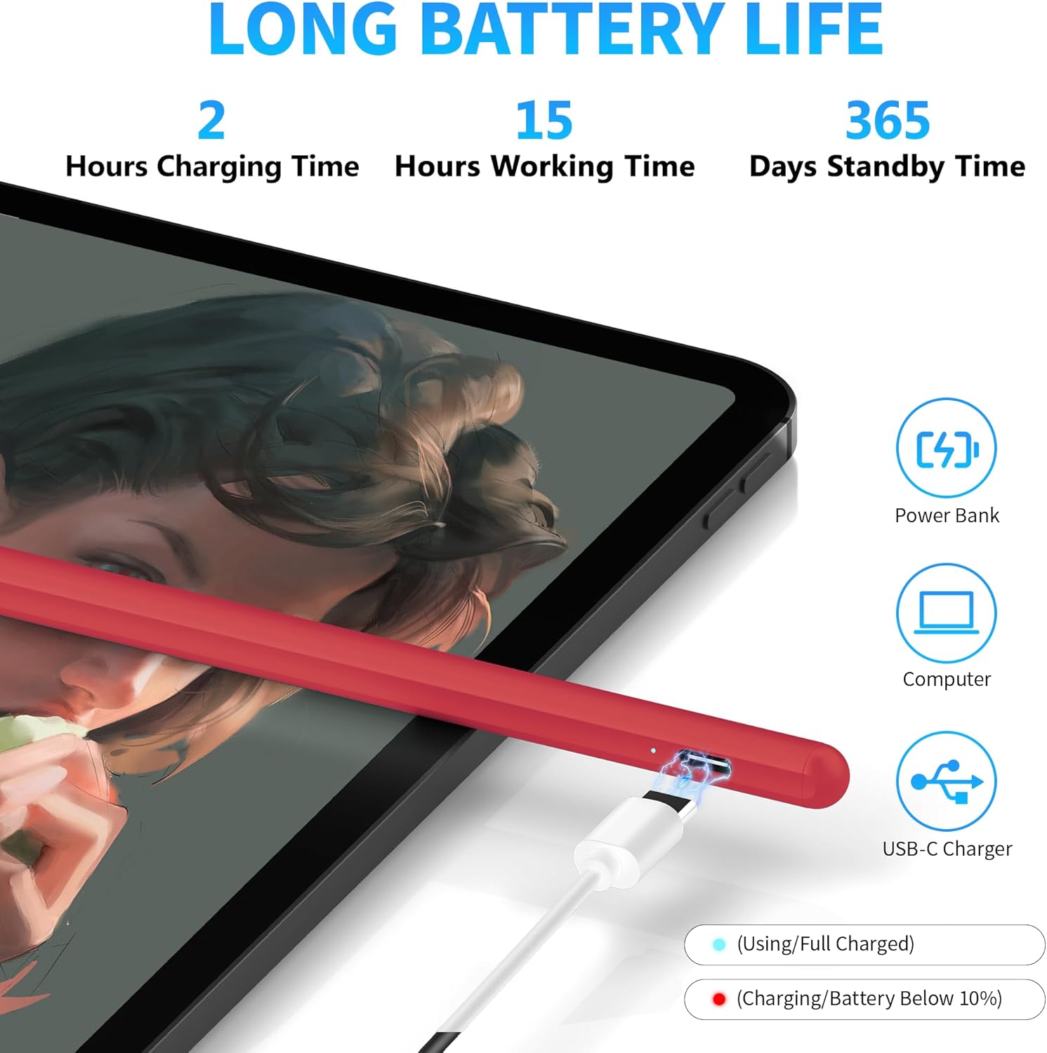 - LONG-LASTING STYLUS- This i-pad stylus is designed to keep up with your busy lifestyle - it only takes 1 Hour to charge and provides up to 20 Hours of continuous use and 30 days of standby time. With a built-in battery and an advanced USB-C charging port, you can focus on your studies or work without worrying about the pen dying mid-task.