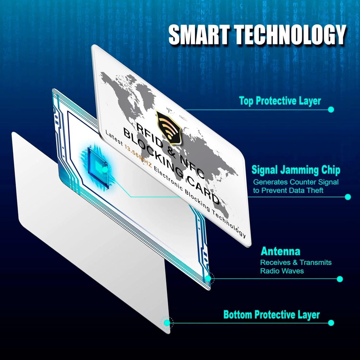 - JAMMING CHIP: An antenna and jamming chip makes up the main components of the card. The antenna will sense incoming radio waves and draw power for the chip to create a jamming signal. Lifetime usage as the card does not require battery.