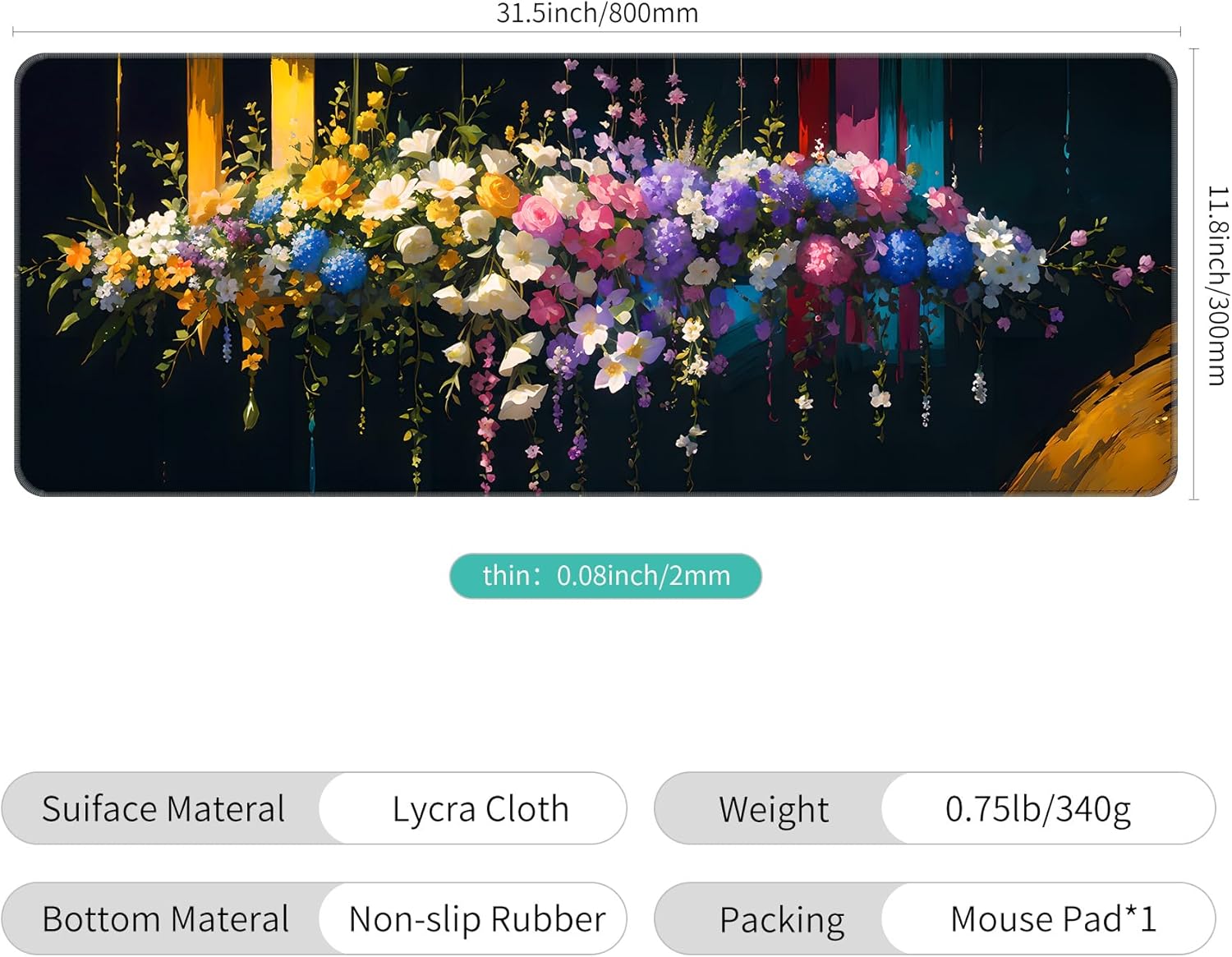 Dynippy Thin Extended Gaming Mouse Pad (31.5 * 11.8 * 0.08 inch) with Stitched Edges Large, Long XXL Keyboard and Mouse pad Desk Mat for Gaming Office & Home - Flower 32
