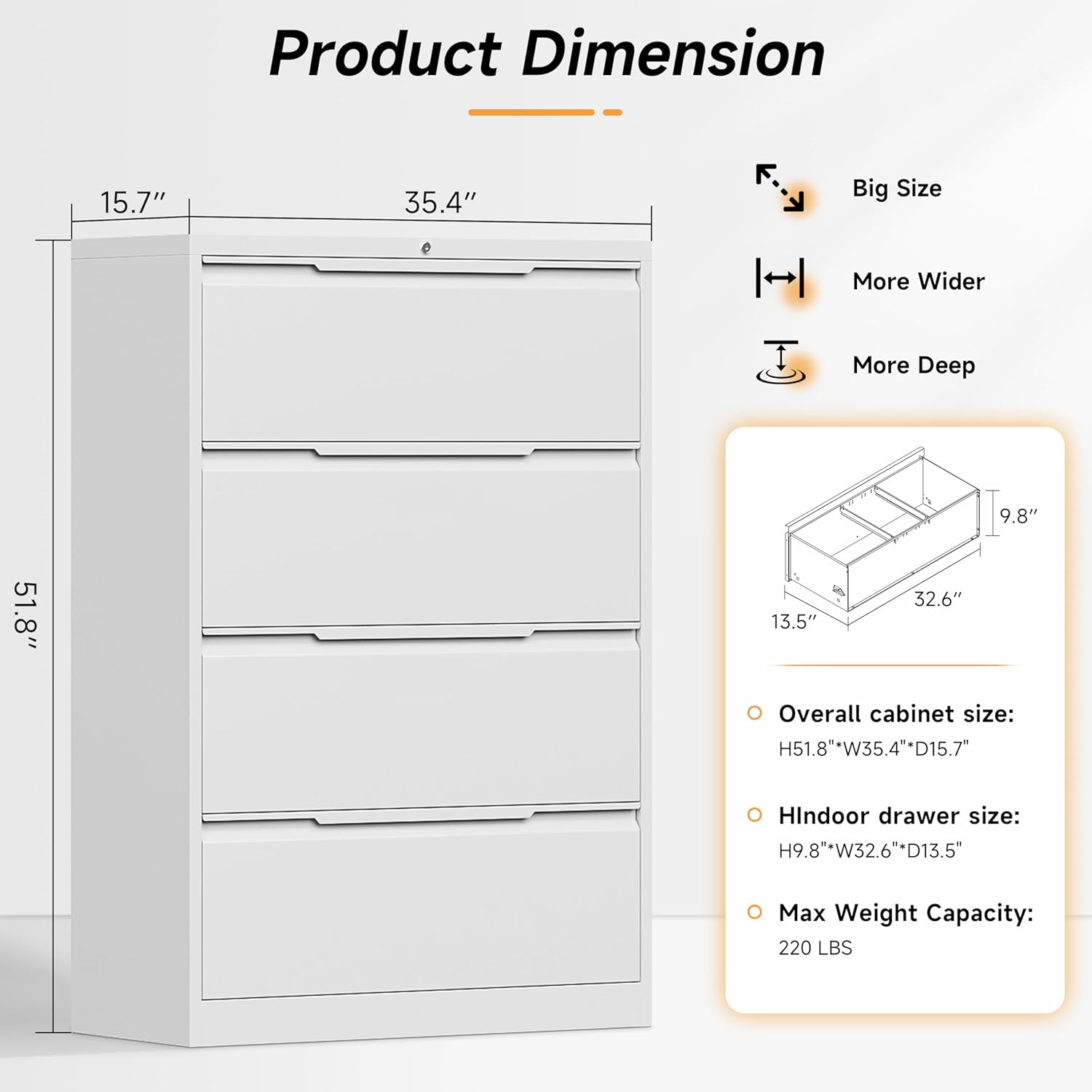 - đȘ ăLARGE CAPACITY FOUR DRAWERăOur 4 drawer lateral file cabinet has a huge storage space, 51.8" high * 35.4" wide * 15.7" deep. And it comes with an adjustable hanging rod to store different types of files, such as letter, legal, A4, F4 and other size folders. It is perfect for you to customize the way you organize your files!