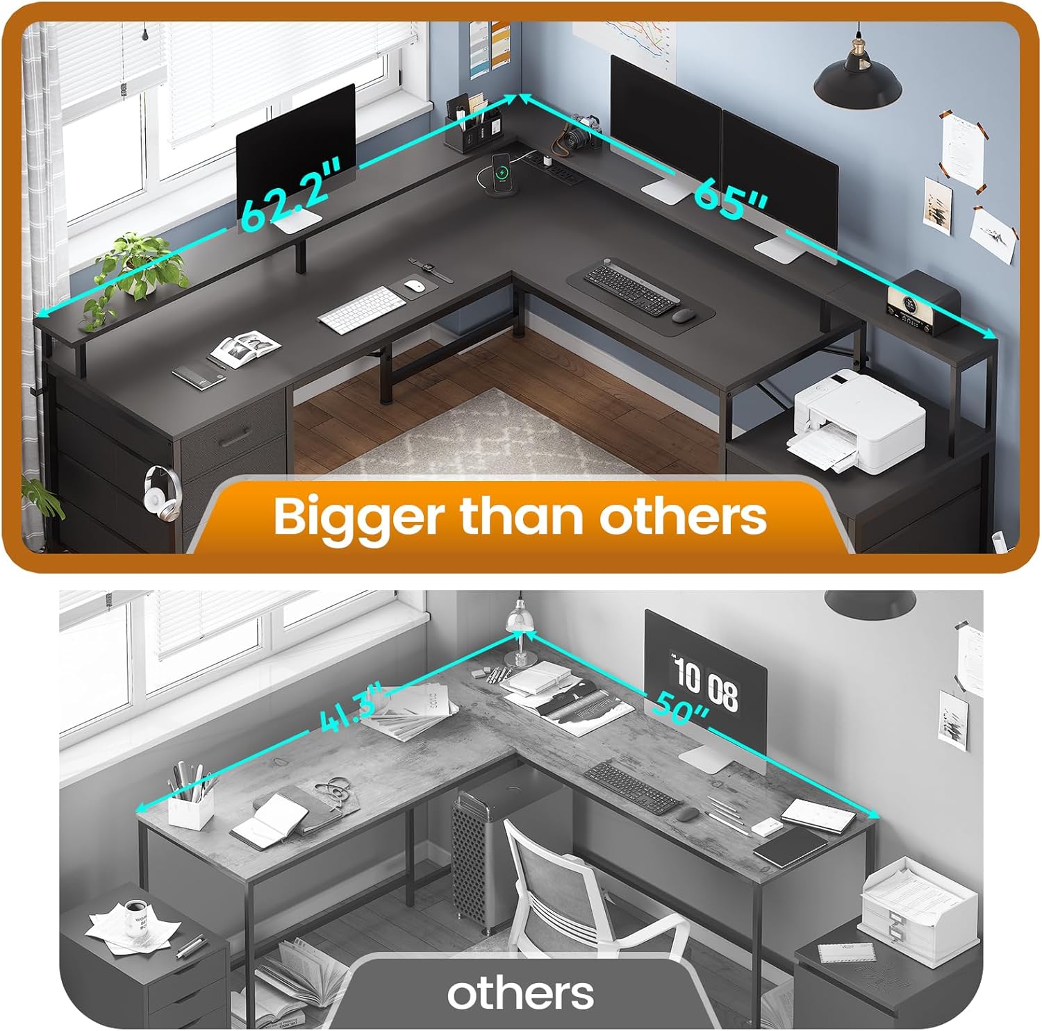 - ăIdeal SpaceăThis computer desk has a spacious desktop. The desktop size is 65"L*19"W and 62.2"L*19"W or 108 inch two person desk. The printer rack can be used for printers of any size commonly seen on the market. The L shaped computer desk could hold three desktop computers and one notebook computer. This computer desk can also be freely deformed into a long square or L-shaped desk according to your use needs.
