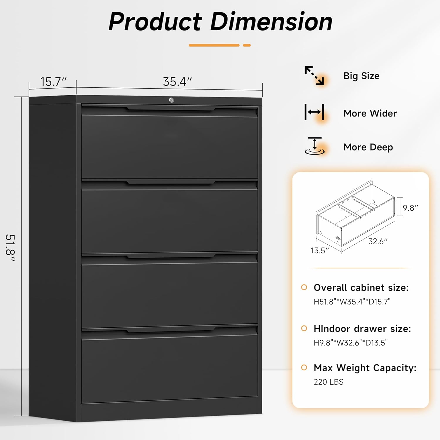 - đȘ ăLARGE CAPACITY FOUR DRAWERăOur 4 drawer lateral file cabinet has a huge storage space, 51.8" high * 35.4" wide * 15.7" deep. And it comes with an adjustable hanging rod to store different types of files, such as letter, legal, A4, F4 and other size folders. It is perfect for you to customize the way you organize your files!