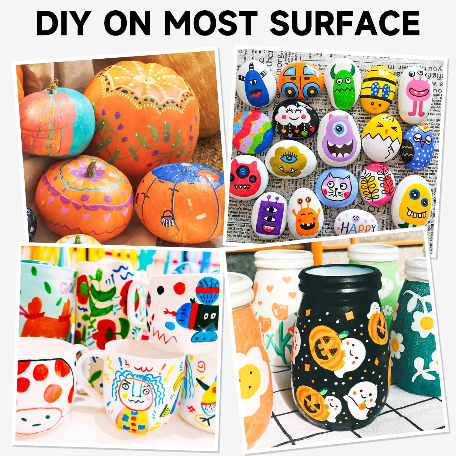 - 【MULTI-PURPOSE】: Enjoy creating art projects on a variety of surfaces, acrylic paint marker set suitable for rock painting, ceramic and mug painting, glass and wine glass painting, wood, fabric, stone, metal, plastic, canvas, Christmas ornament, Halloween pumpkin painting, calligraphy, scrapbook, bullet journal, brush lettering, custom mugs, DIY crafts projects, and much more for both smooth and porous surfaces.