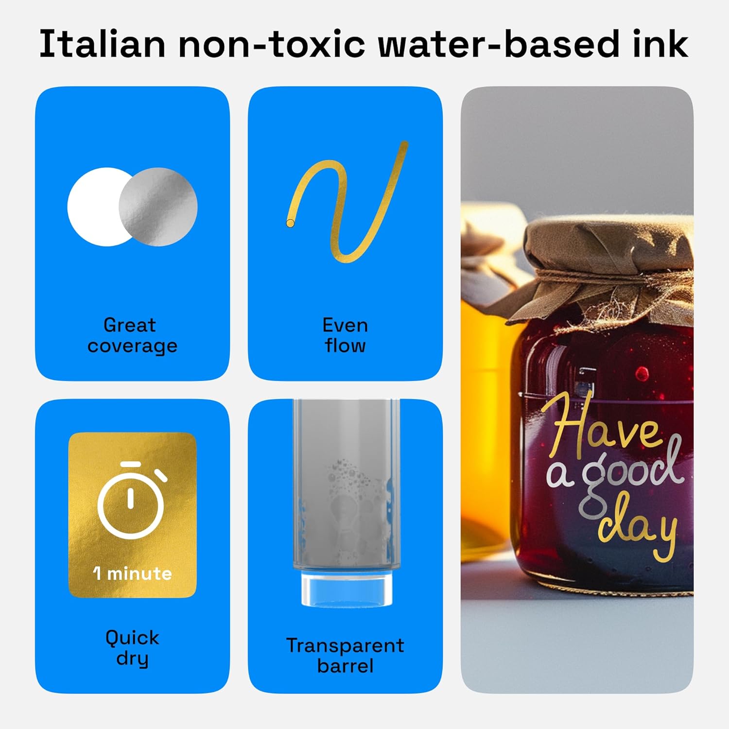 - PREMIUM QUALITY: This Artistro 2-pack of medium fine Gold & Silver acrylic paint pens utilizes vivid, acrylic ink that dries quickly to produce a durable opaque and glossy finish on any surface. Each acrylic paint pen is equipped with Italian ink and a durable Japanese nib.