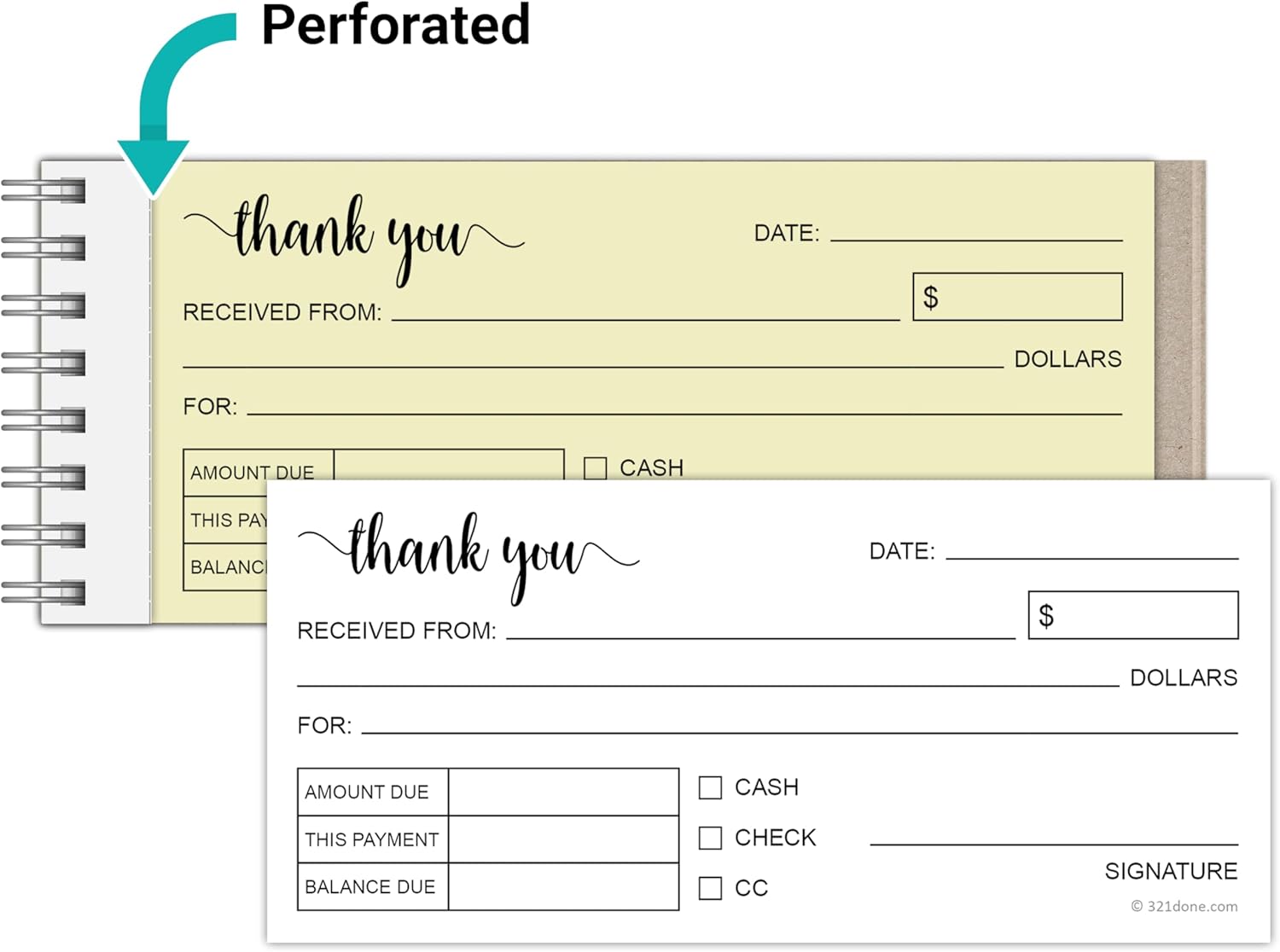 321Done Thank You Receipt Book, Made in USA - 2.75x6, 2-Part Carbonless Spiral Bound, Sales Order Form, Invoice Pad with Carbon Copies for Small Business - 50 White/Yellow Pages