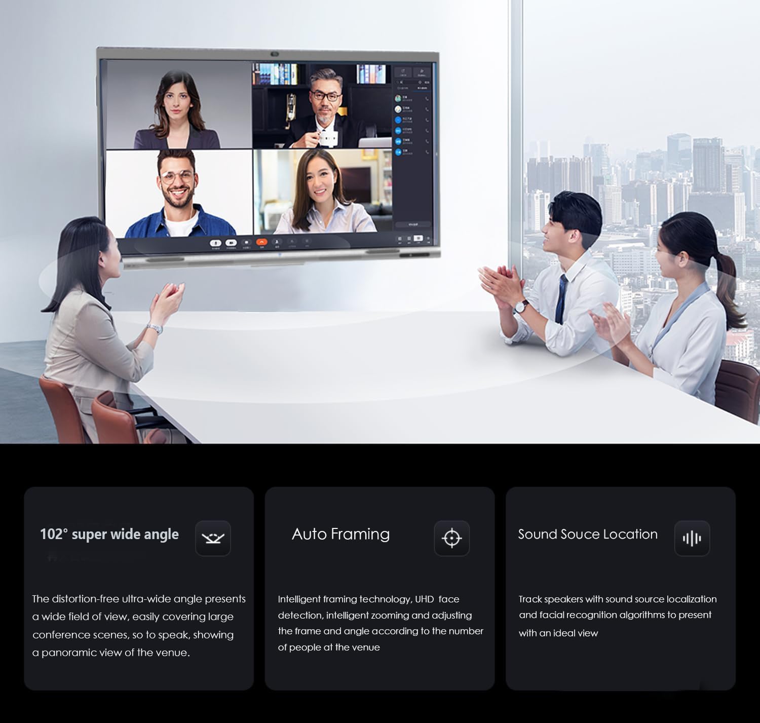 - ăReal-time Remote Video ConferencingăThe electronic whiteboard has a built-in professional conference-level auto framing AI camera and an 8-meter sound pickup matrix. The sound source positioning microphone can complete video conferencing excellently. Perfectly compatible with Zoom, Google Meet, Microsoft Teams, Webex and other popular 3rd party video conferencing. Whether itâs a team brainstorming session or a virtual meeting, itâs easy to handle.