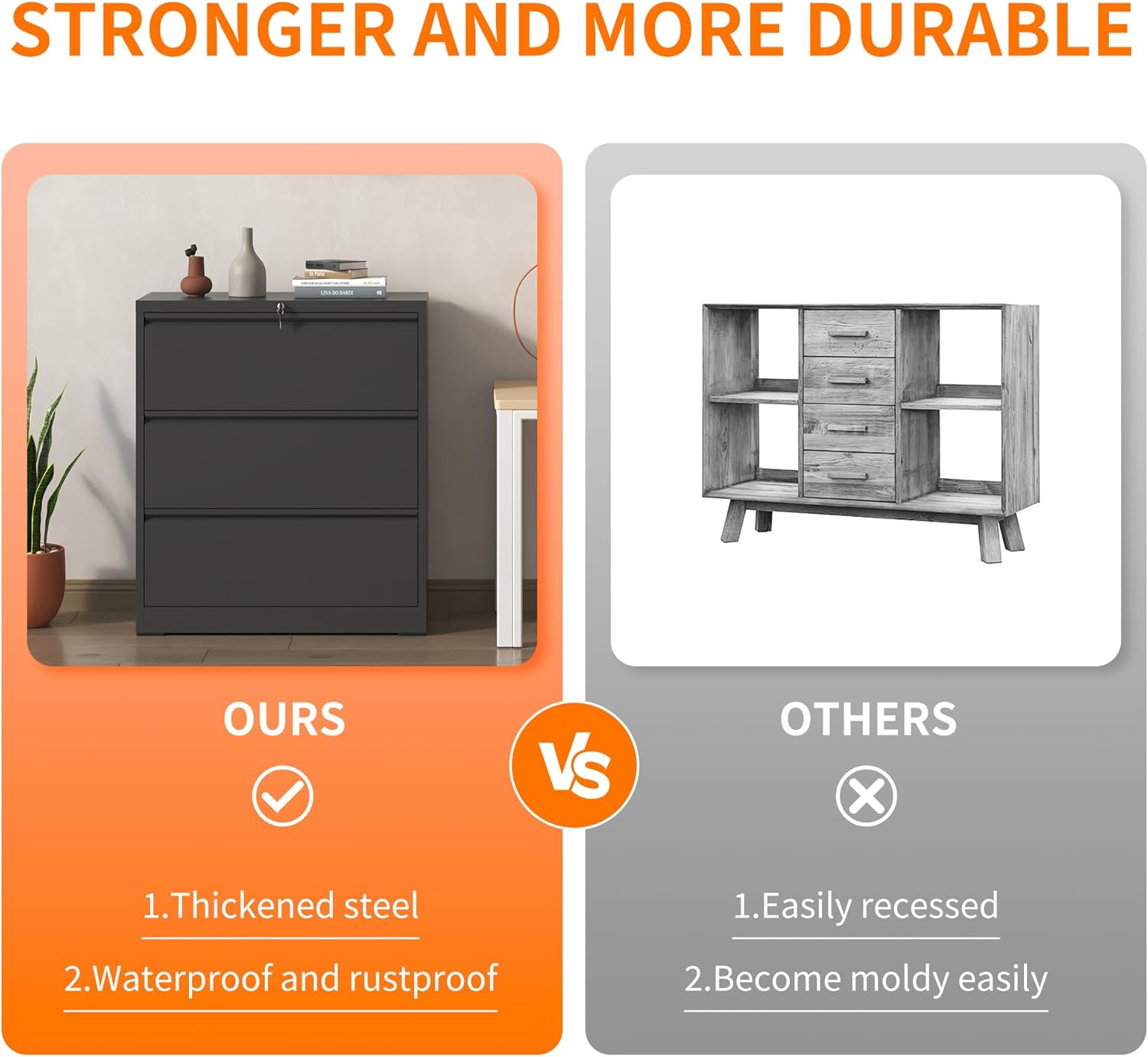 - 【Solid & Durable】Crafted from whole-in-one reinforced high-strength cold-rolled steel, this locking lateral file cabinet ensures remarkable sturdiness and longevity. Each drawer can bear a maximum load of up to 110lbs, showcasing its robust construction. The combination of a strong structure and a powder coating surface process makes this wide cabinet highly resistant to rust, scratches, and ensures easy cleaning, maintaining its pristine appearance over time.