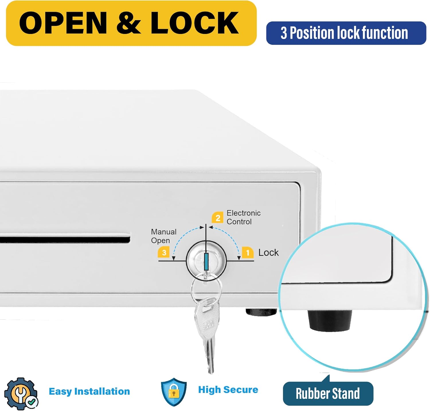 - 💳3-Position Lock& Dual Front Media Slots: This cash drawer not only ensures the highest level of security with a 3-position lock mechanism: 1-Lock, 2-Auto Open by Printer/POS, 3-Manual open