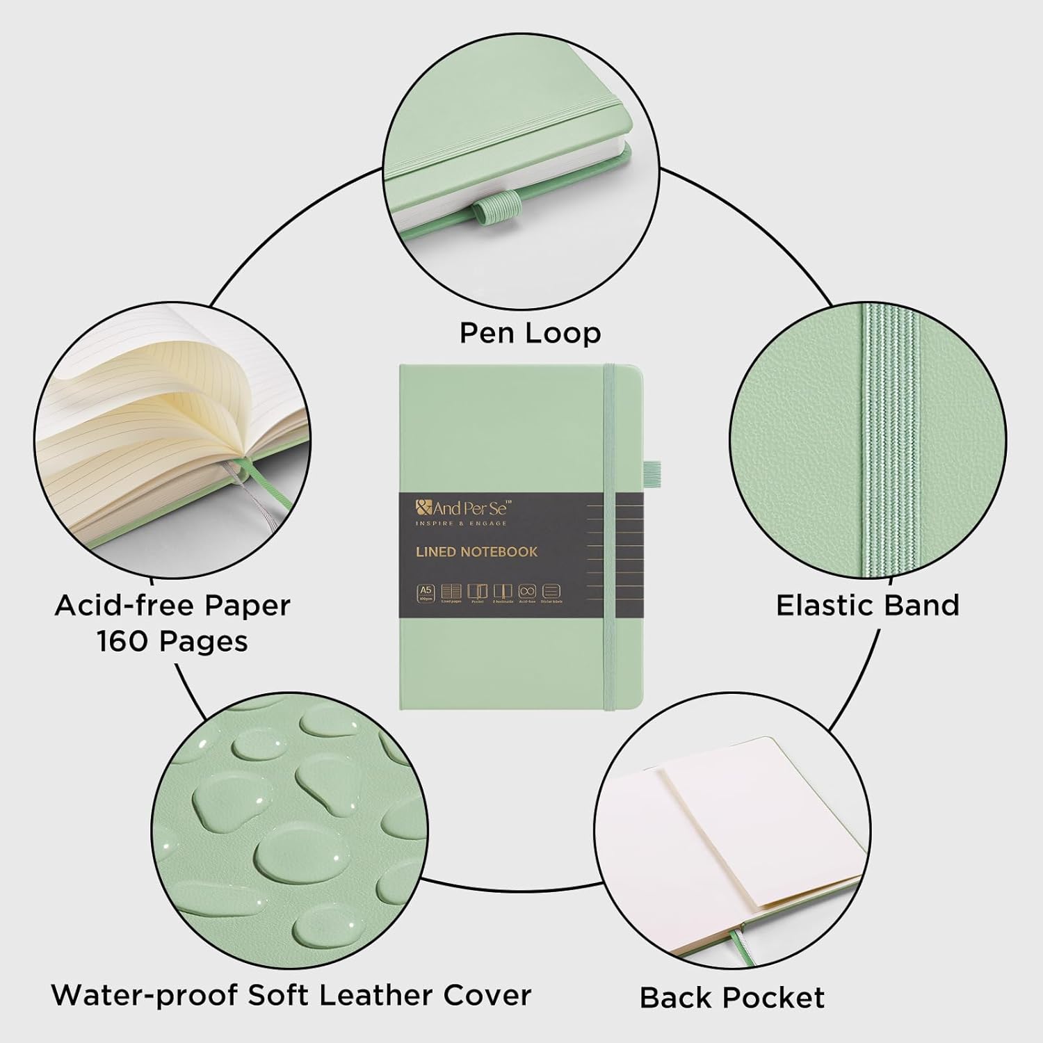 &And Per Se Lined Journal Notebook, 160 Pages, A5 5.7 x 8 inches College Ruled Thick Paper Notebook Journals for Writing, Hardcover Notebooks for Women Men Office School (1 Pack, Light Green)