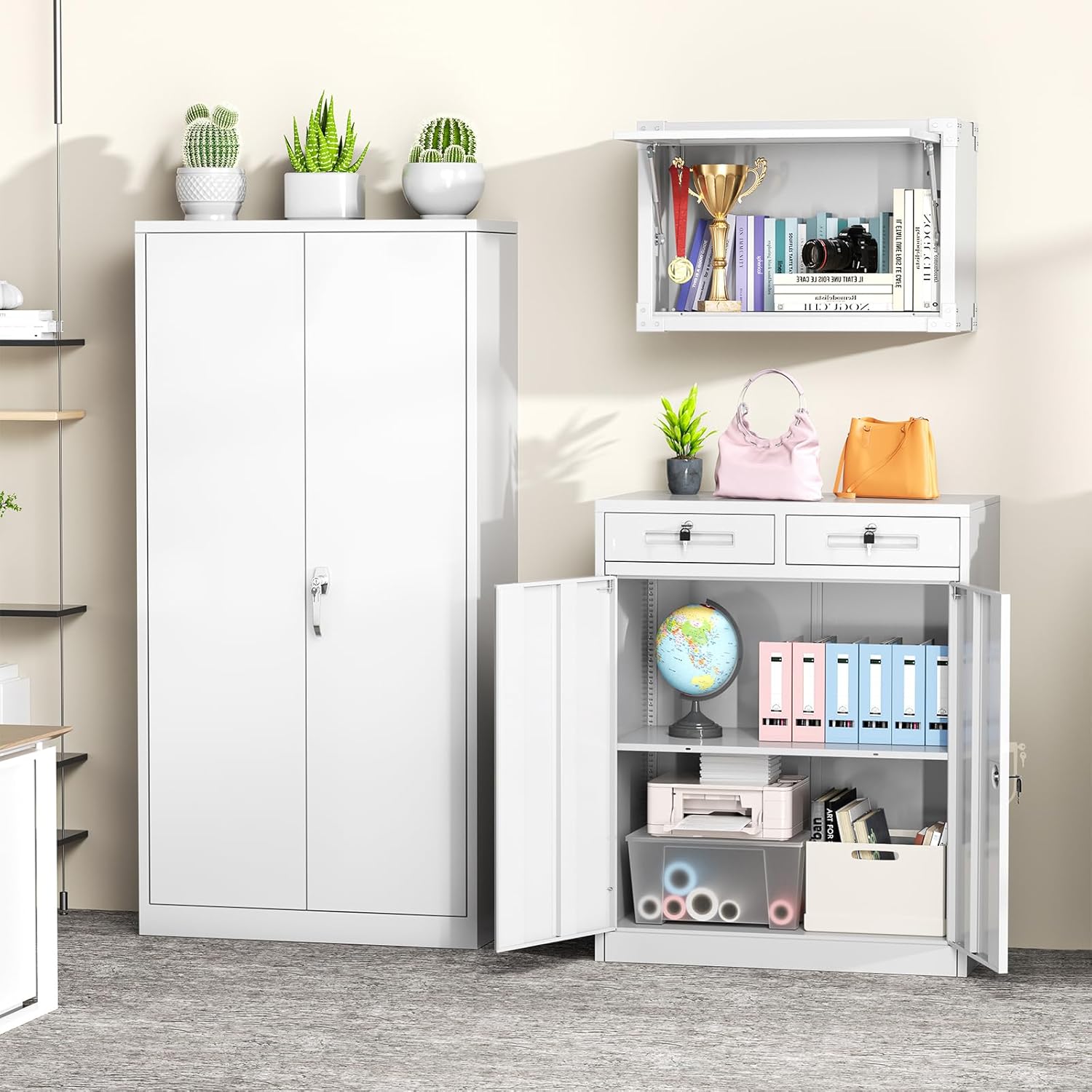 Greenvelly Metal Storage Cabinet, 42' White Steel Garage Cabinet with 2 Doors, Adjustable Shelves, Locking for Office, School or Tool Organization