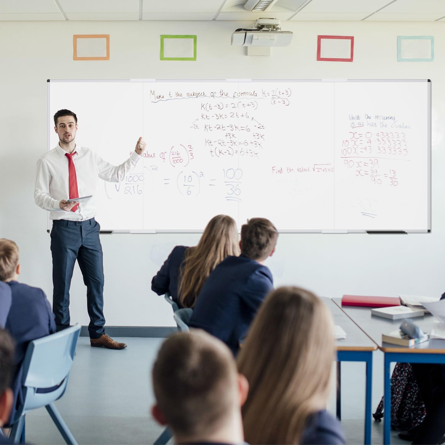 - [What You Get ] Oversized Magnetic whiteboard with Overall size 120" x 48" ( frame included); Package size: 49.21" x 30.12" x 2.56"; Writing surface size: 118" x 46" ; Include fixing kits and pen tray accessories.