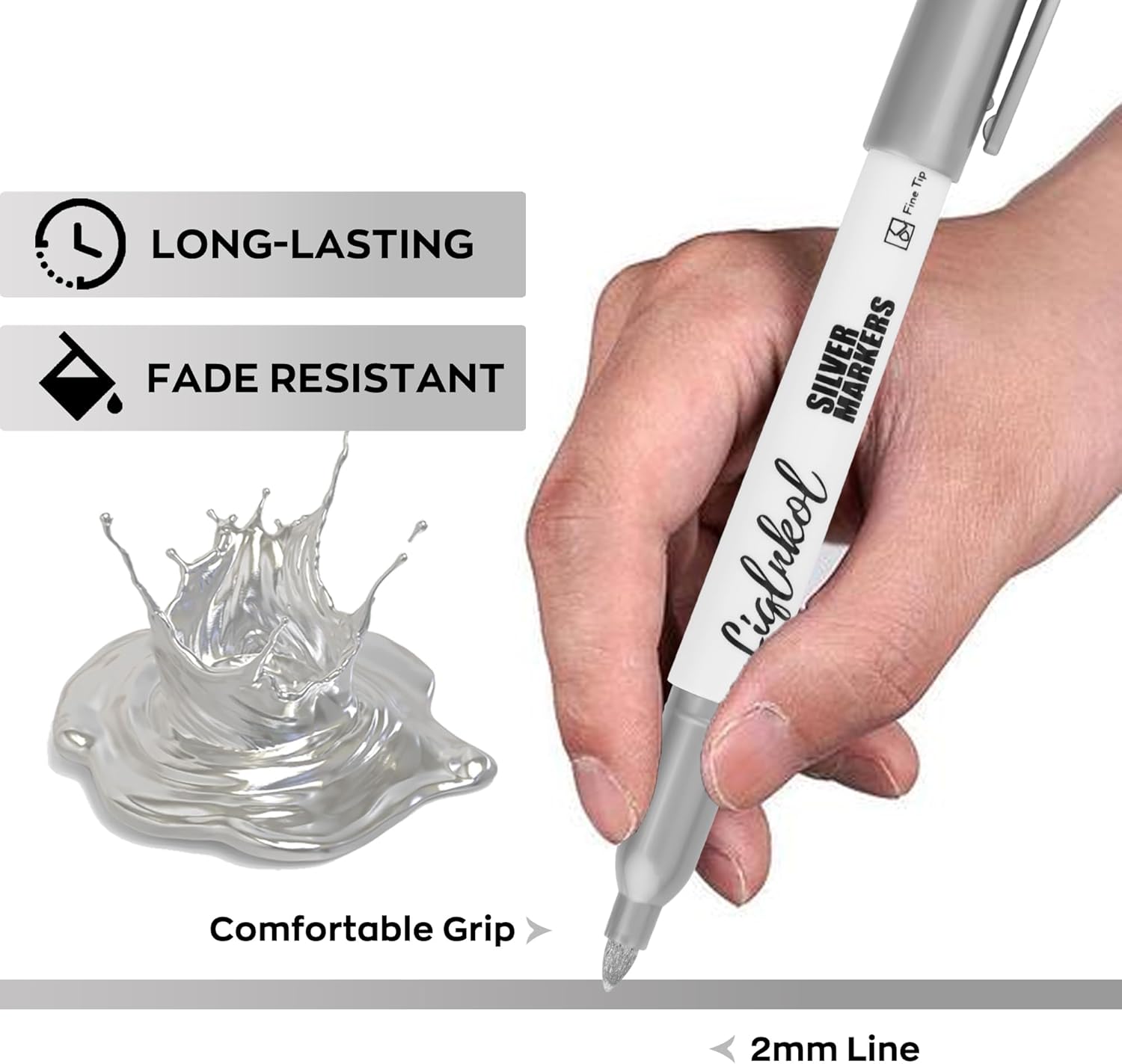 - Safety guarantee : LiqInkol Silver Metallic Markers are lightweight and ergonomic. Along with having a fiber tip, water-based ink, and being non-toxic, odorless, and environmentally friendly. Vibrant colors, smooth writing, quick-drying, strong coverage, and fade resistant. The ink will not bleed through the paper to help you create your art.