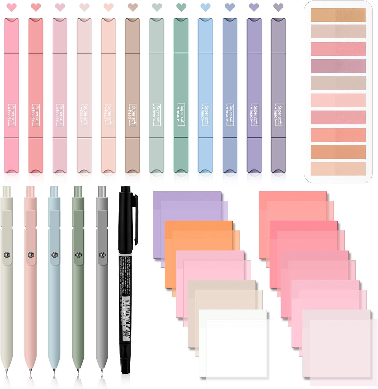 Jutom 38 Pcs Book Annotation Kit Aesthetic Highlighters Gel Pens Set Sticky Notes Tabs Markers Dual Ended Highlighter Quick Dry Ink Pens for Office Annotating Books(Pink Series,Square)