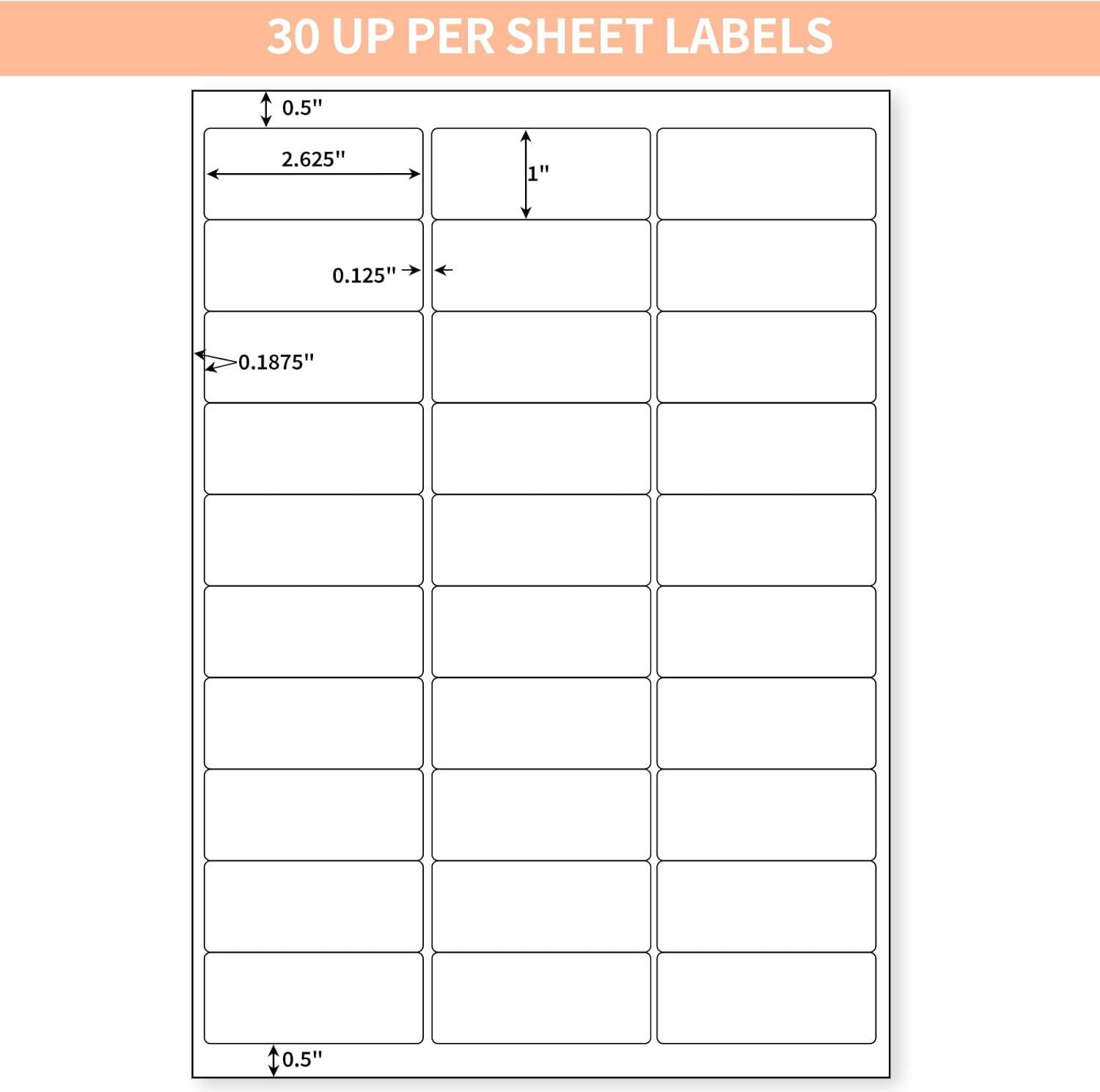 - ✔️【30 UP Labels Per Sheet, 50 Sheets = 1500 Labels 】Label Size: 1" x 2-5/8", Paper Size: 8.5" x 11" (US Letter Size) White Permanent Adhesive Label Printer for Laser/Inkjet, Perfect for FBA, FNSKU, Barcodes , name, address labels, etc.