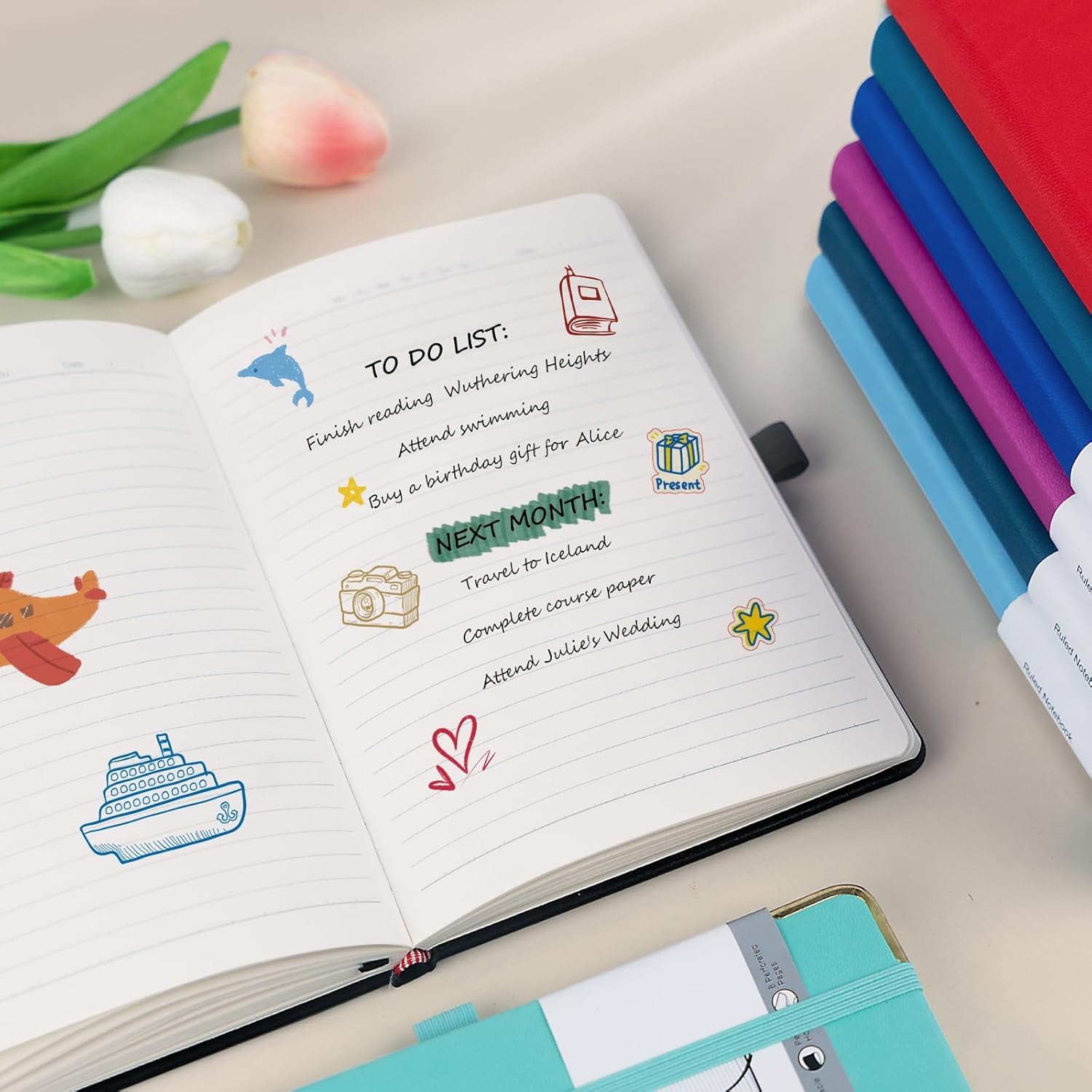 - Bright & Bold Colors: Our notebook journals for women & men are designed with 8 colors-Black, Red, Raspberry, Sky Blue, Klein Blue, Night Sky Blue, Mint, Turquoise. The size of the notebooks for work is 5.5" x 8.3", portable. A5 travel journal fits for note taking, life scheduling, journaling, teaching and studying. Great journal notebook for Christmas gift, business work, college, travel, school, office and home. This makes for an exceptionally special and perfect Christmas present to share with your friends and family