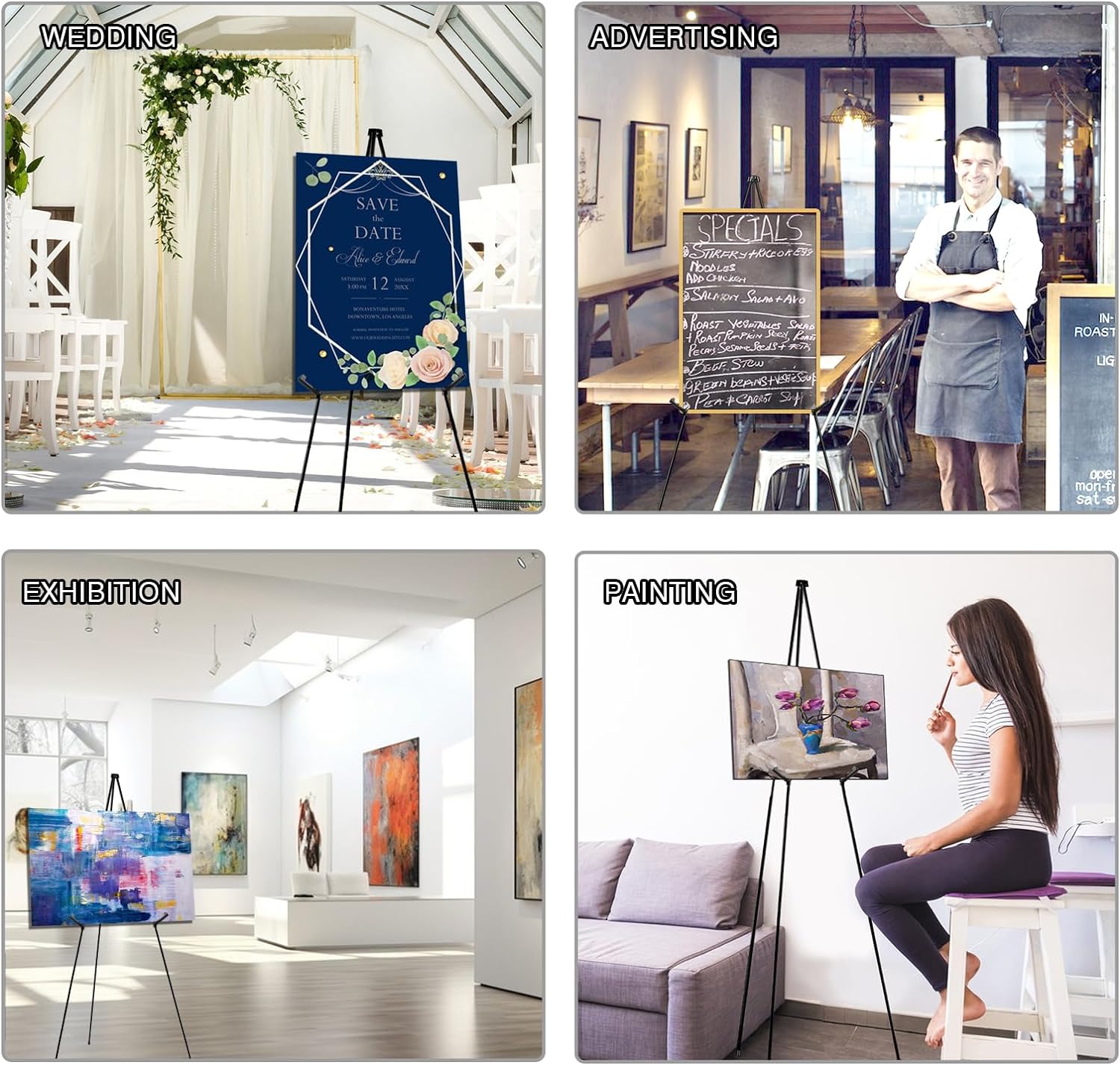 - 【Usage Scenario】 A handicraft stand used to display lightweight logos such as wedding signs, welcome signs, baby showers, events, etc. It is suitable for displaying wooden signs, acrylic signs, foam boards, dry wipe whiteboards, poster boards and photo frames.