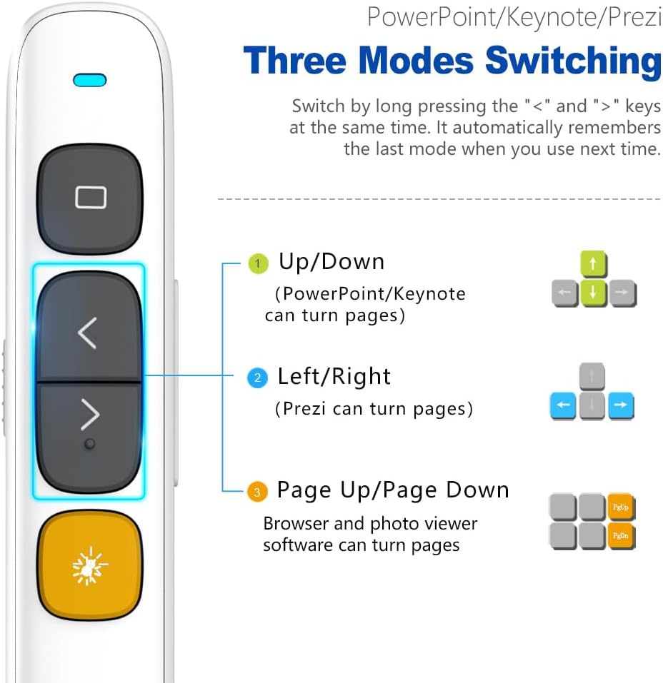 - Plug&Play and Wide Compatability: Simply plug the USB receiver into your devices like computer/laptop/ipad, Then you can start. The presentation clicker supports leading presentation software include PowerPoint, Prezi, Keynote, Google Slides, Propresenter, MediaShout and more, works in Windows, macOS, Android, Linux system