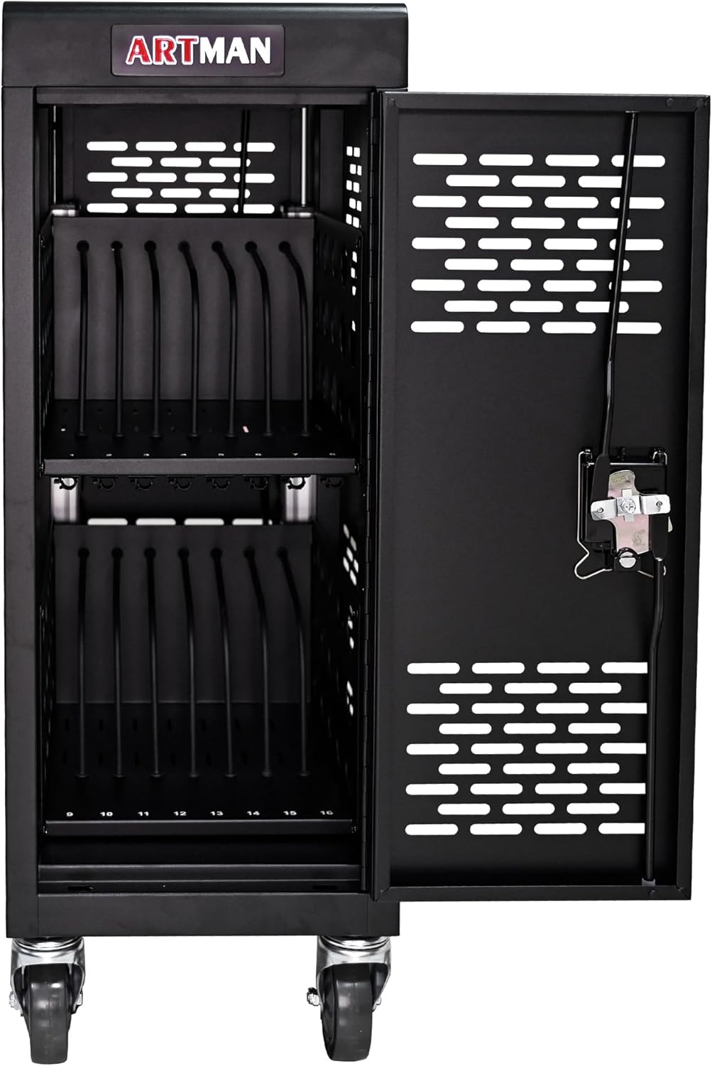 - LOCKING & SAFETY : laptop & tablet storage carts is equipped with lock & key for the front and back door, which will protect your device when it is in working or you are moving the cart. And 2 locking caster wheels can keep cart in place. The ventilated panels reduce overheatingļ¼ensuring safety during charging.