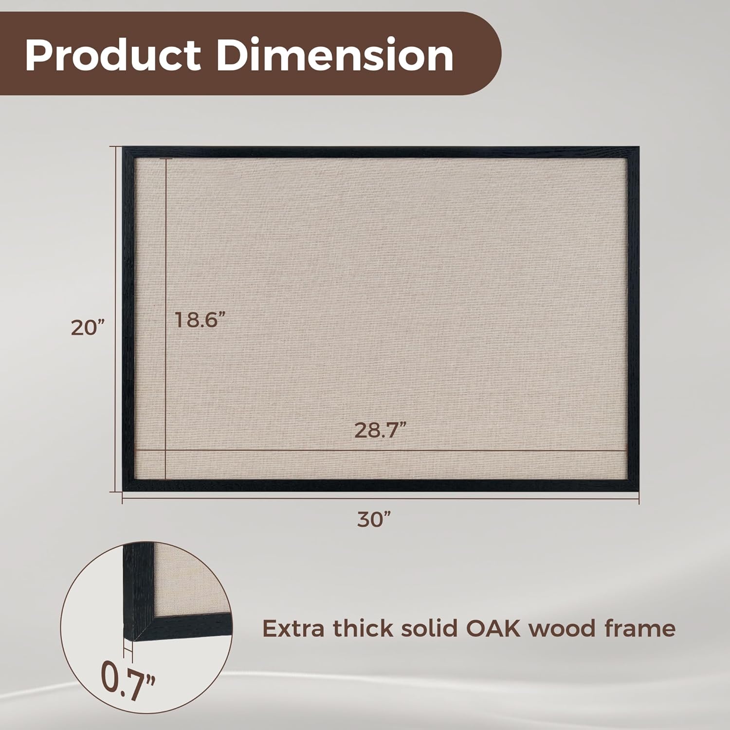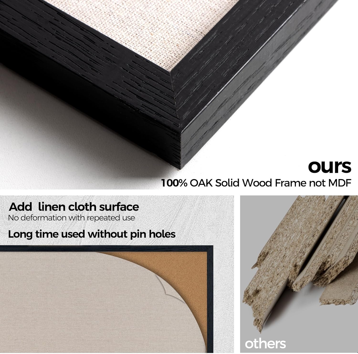 - Oak Frame Material: Our cork boards for walls is made of 100% pine wood which has well self-healing ability and repairability. The pin board features a four-ply splint design that is strong and thick enough not to be punctured by thumbtacks.