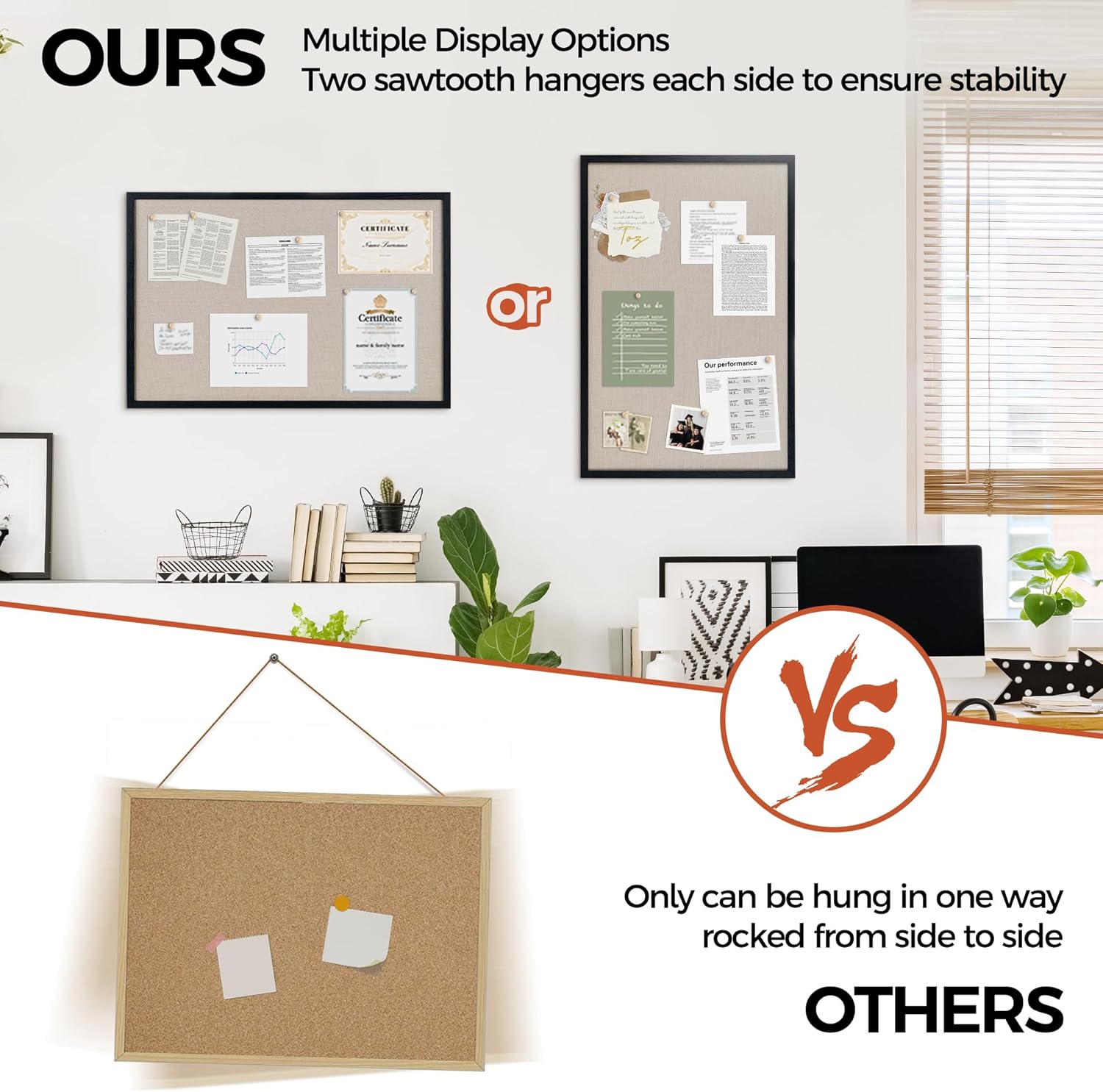 - Unique Design: Easily customize the board orientation to fit your space. Natural cork bulletin board add a classic look to your office or home. Both strong and stylish, it will be a great addition to your space.