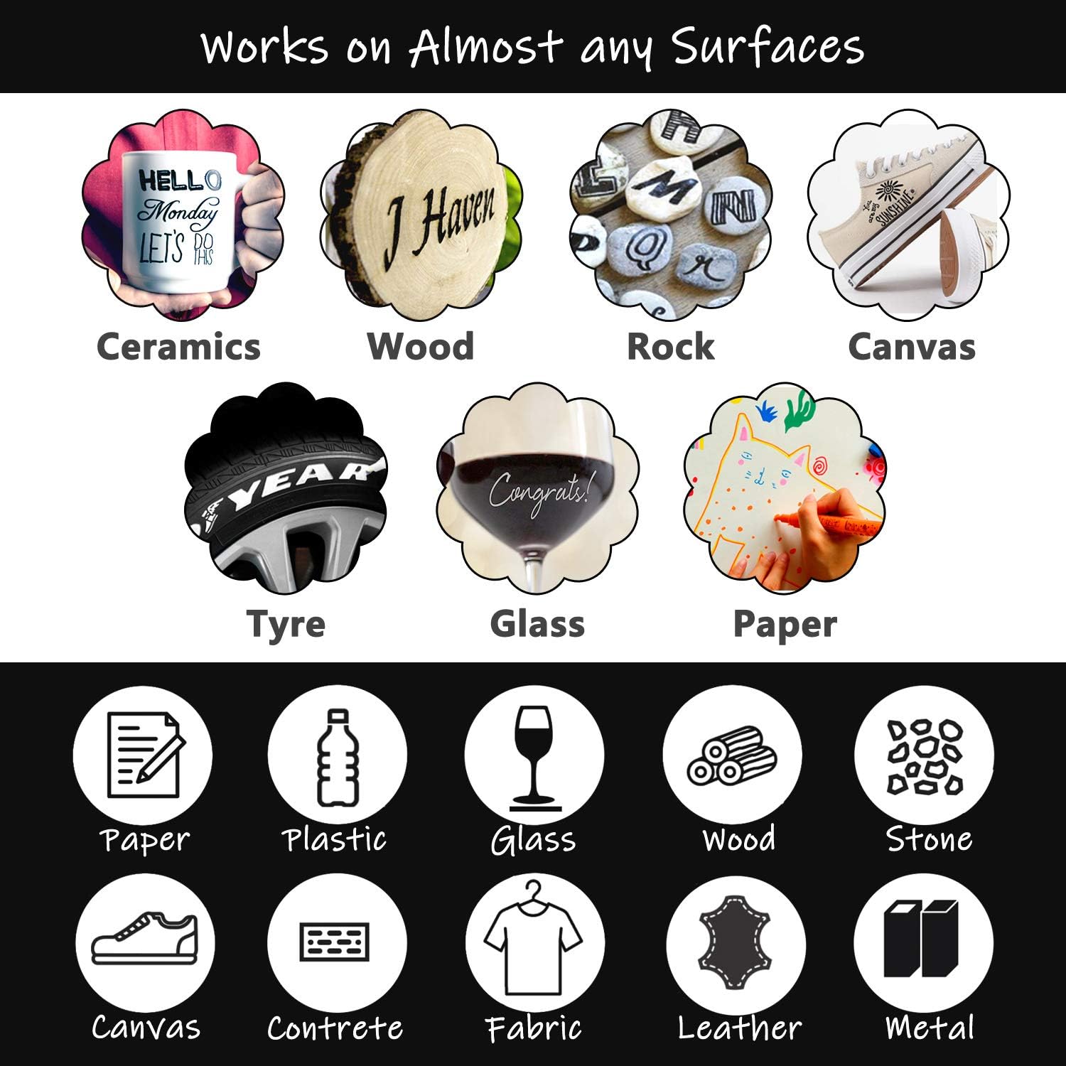- WORKS ON ALMOST ANY SURFACES: The paint pens works on almost any surfaces such as rock, canvas, wood, metal, glass, ceramic, plastic, tire, etc. They are the best tool for creativities