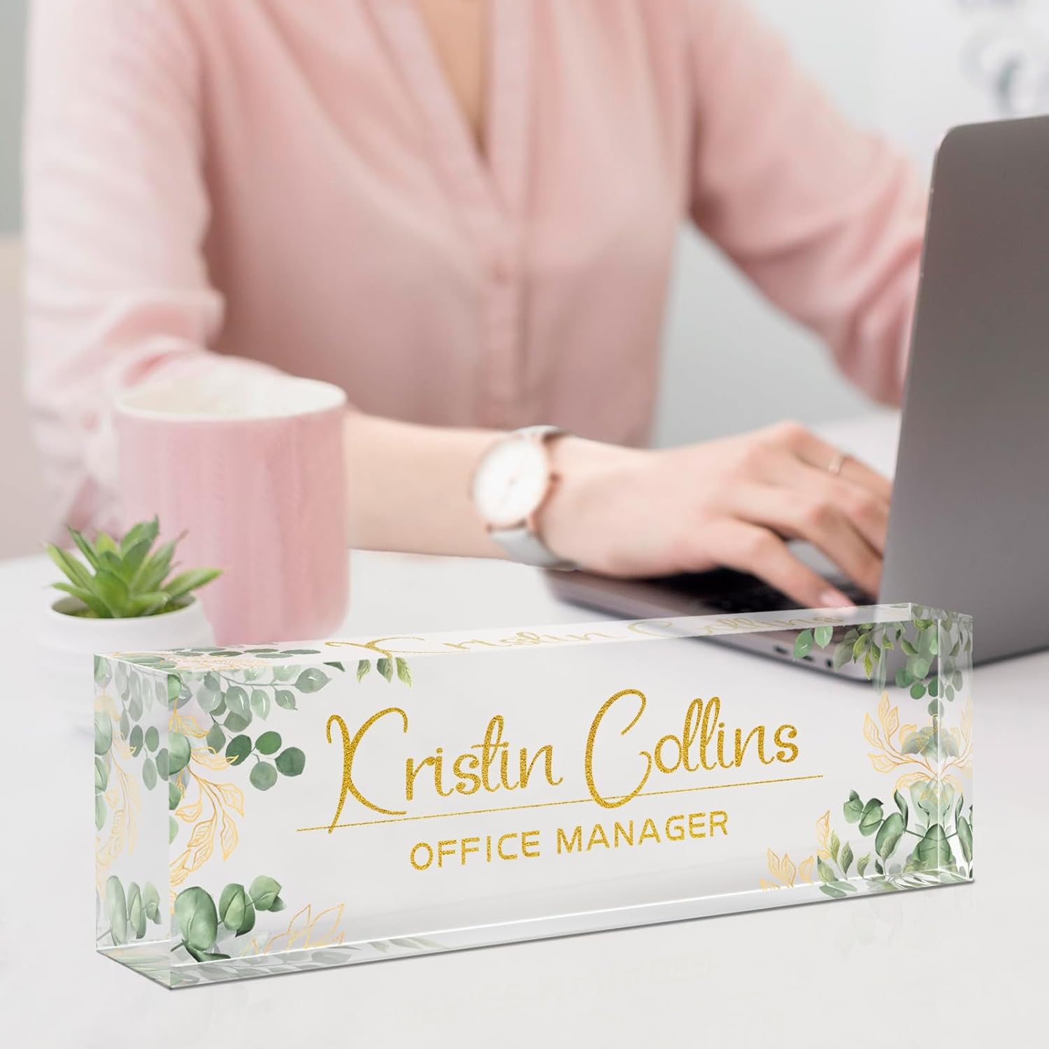 Custom Name Plate for Desk, Acrylic Office Decor For Women Men, Personalized Office Desk Accessories, Teacher Employee Appreciation Gifts For Social Worker Boss Coworkers (Green Leaves)