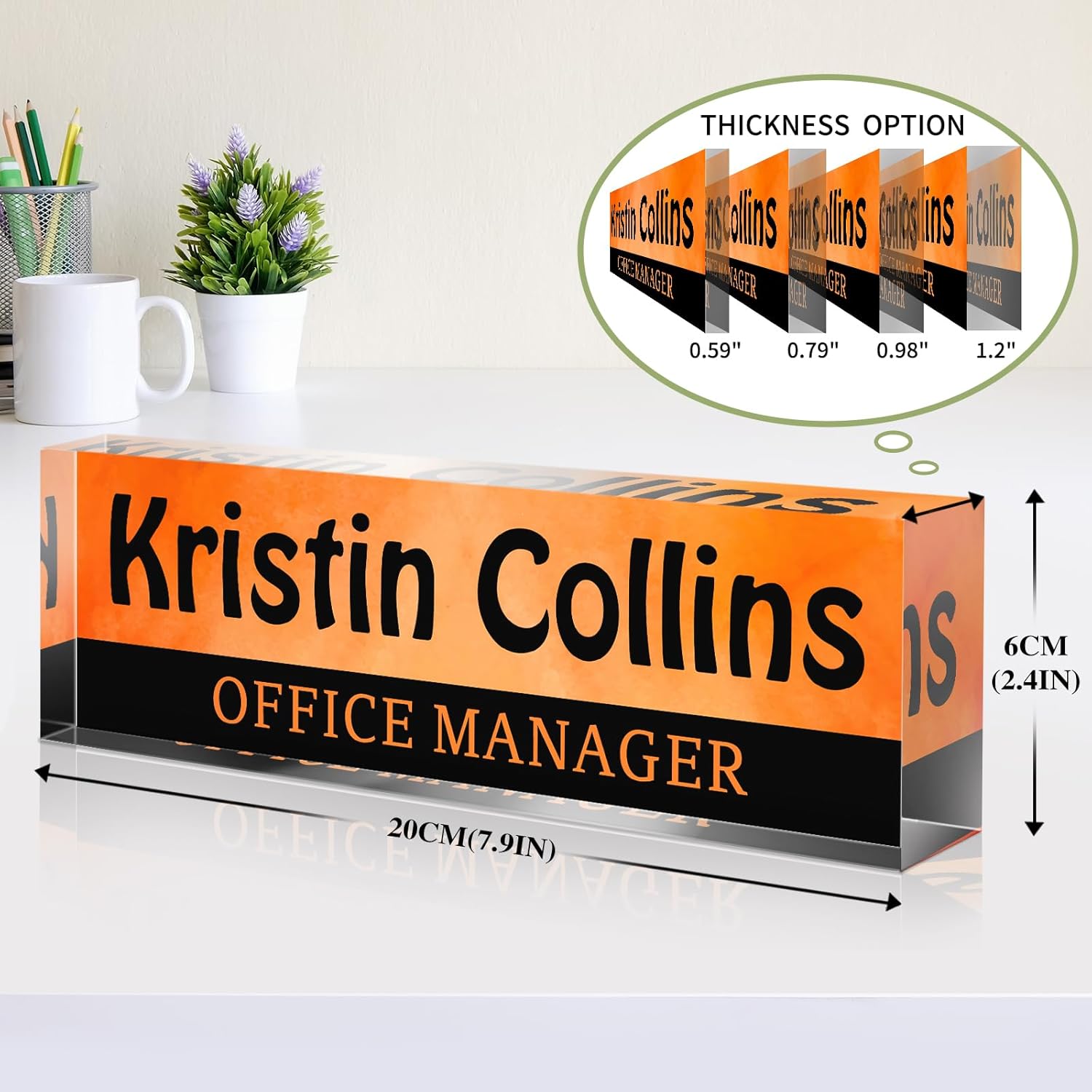 - 💎 Premium Quality: Crafted from premium acrylic, the personalized desk nameplates are built to last. With exceptional durability and clarity, they're ten times stronger than glass. And thanks to the special UV printing technique, the colors stay vibrant and the text stays sharp, no matter how much time goes by.