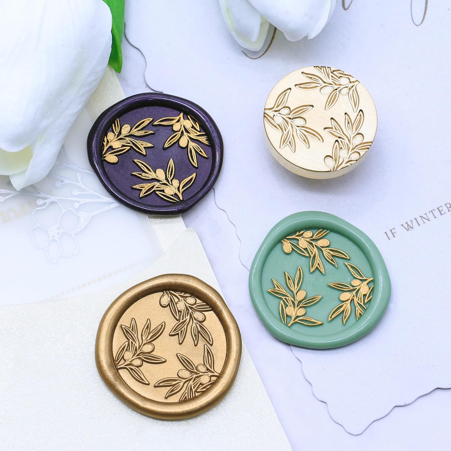 - Olive Branches Wax Seal Stamp Kit: Seal head diameter: 25mm/0.98''; total lenght of the stamp: 90mm/3.54''. Packing includes: 1 x olive branches wax seal stamp + 200pcs sealing wax beads (10 colors) + 1 x wax seal melting spoon + 1 x candle + 1 wax seal pen.